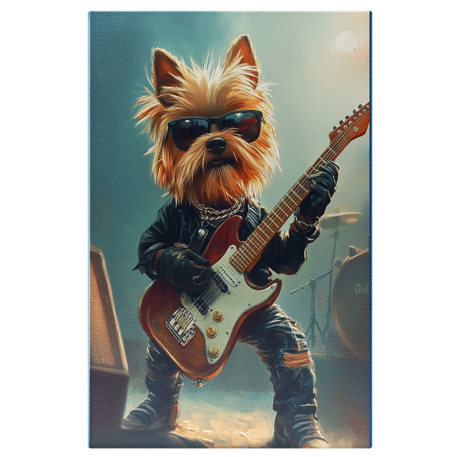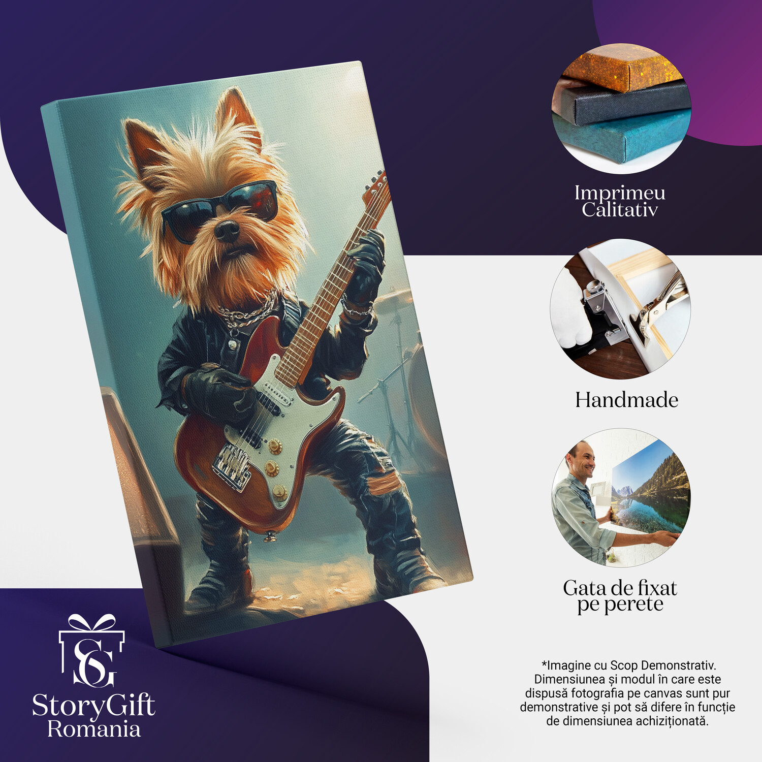 Tablou Canvas Personalizat Muzician Pe Scena Chitara Electrica, Muzica Rock, Jacheta Si Manusi De Piele, Concert 140x90CM