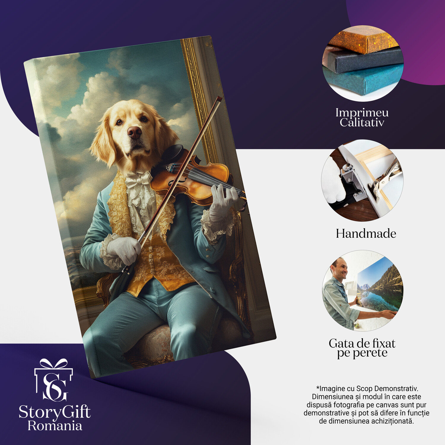Tablou Canvas Personalizat Muzician Regal Cantand La vioara, Costum Albastru, Cu Funda Si Guler Inalt Stil Ruff 140x90CM