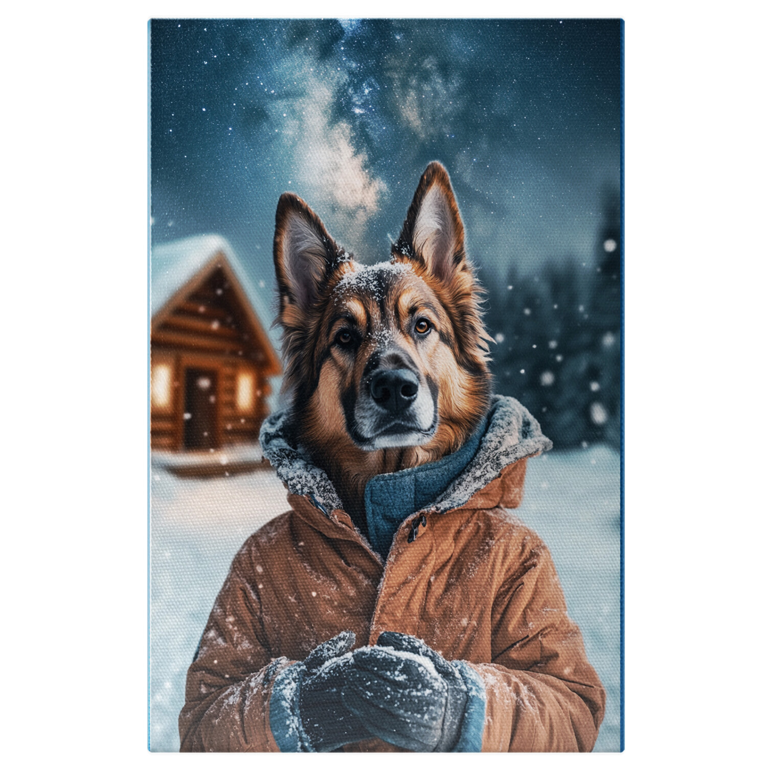 Tablou Canvas Personalizat Portret Cu Tinuta Strdala Jacheta Portocalie Cu Manuis Crosetate Cabana In Munte Inghetata, Cer Stralucitor, Polul Nord 40x25CM