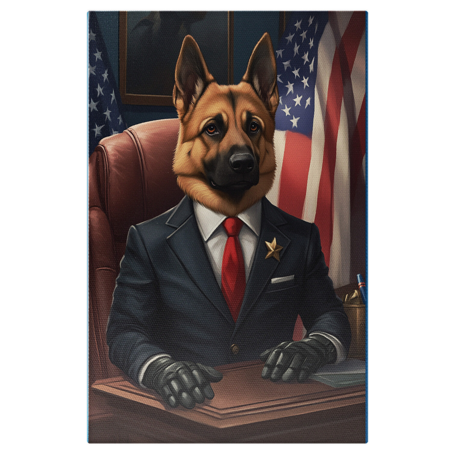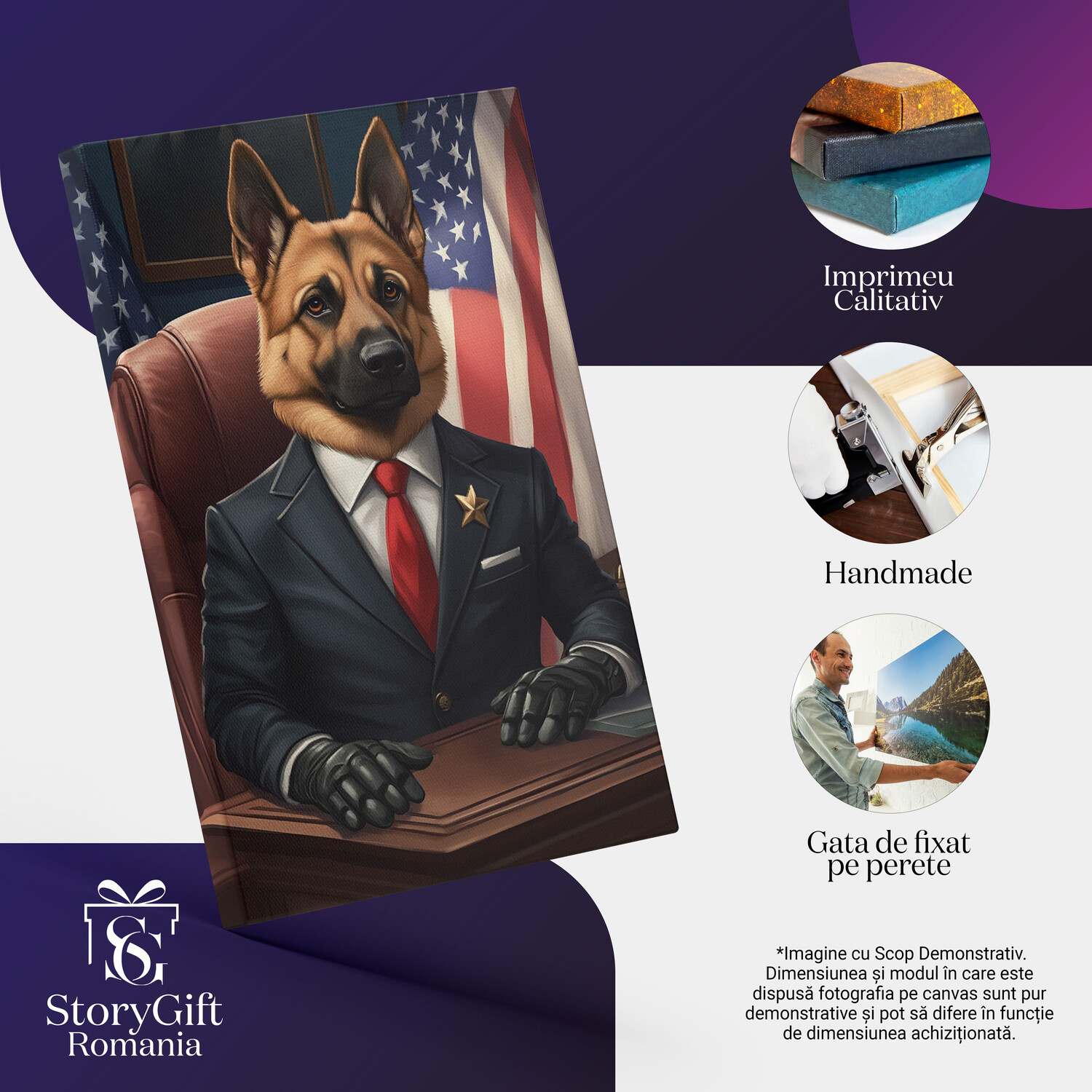 Tablou Canvas Personalizat Portret Prezidential, Sef De Stat In Tinuta Eleganta La birou Still Modern Costum Bleumarine Cu Cravata Rosie si Si Stea De Aur In Piept 120x80CM