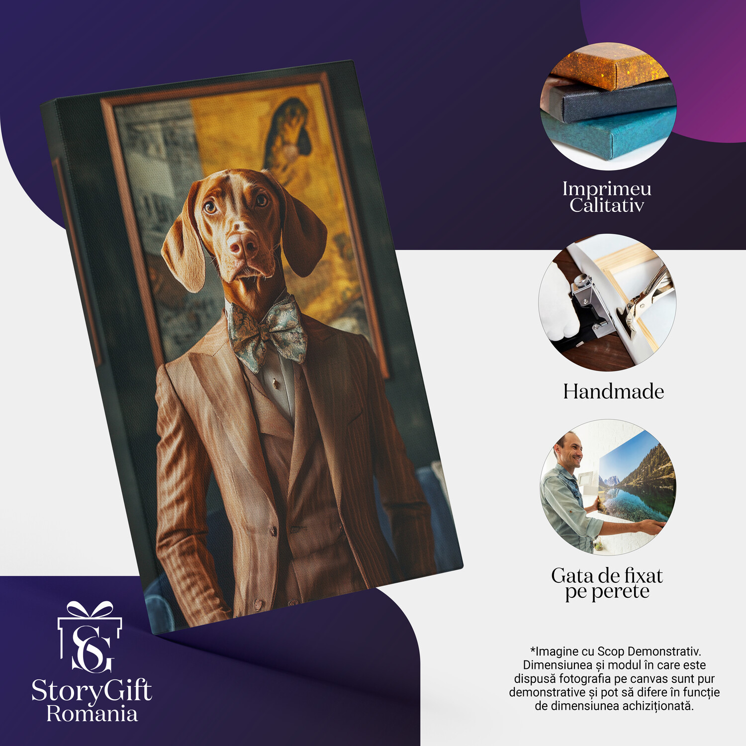 Tablou Canvas Personalizat Portret Stil Aristrocrat Masculin, Costum Maro Cu dungi, Papion Masiv Albastru Cu Detalii Auri 120x80CM