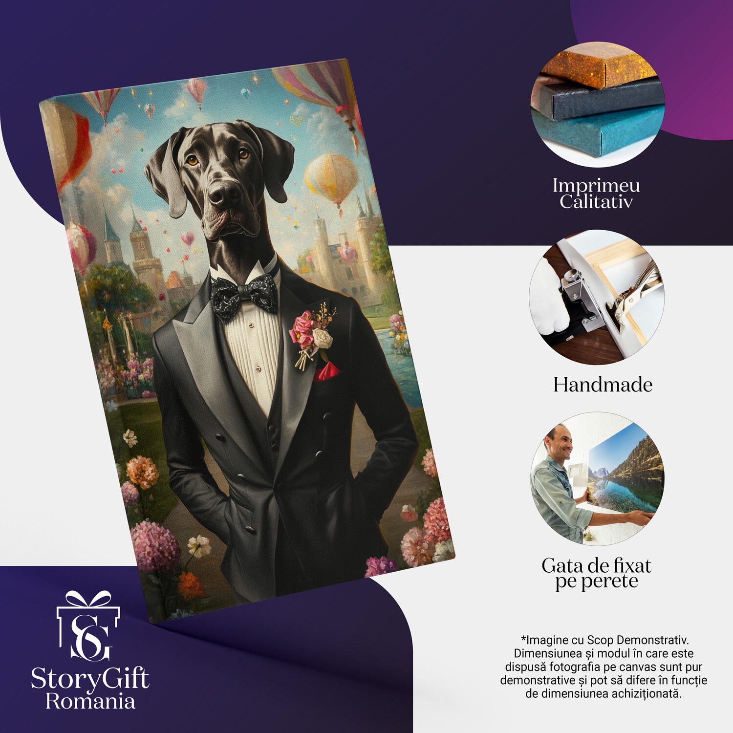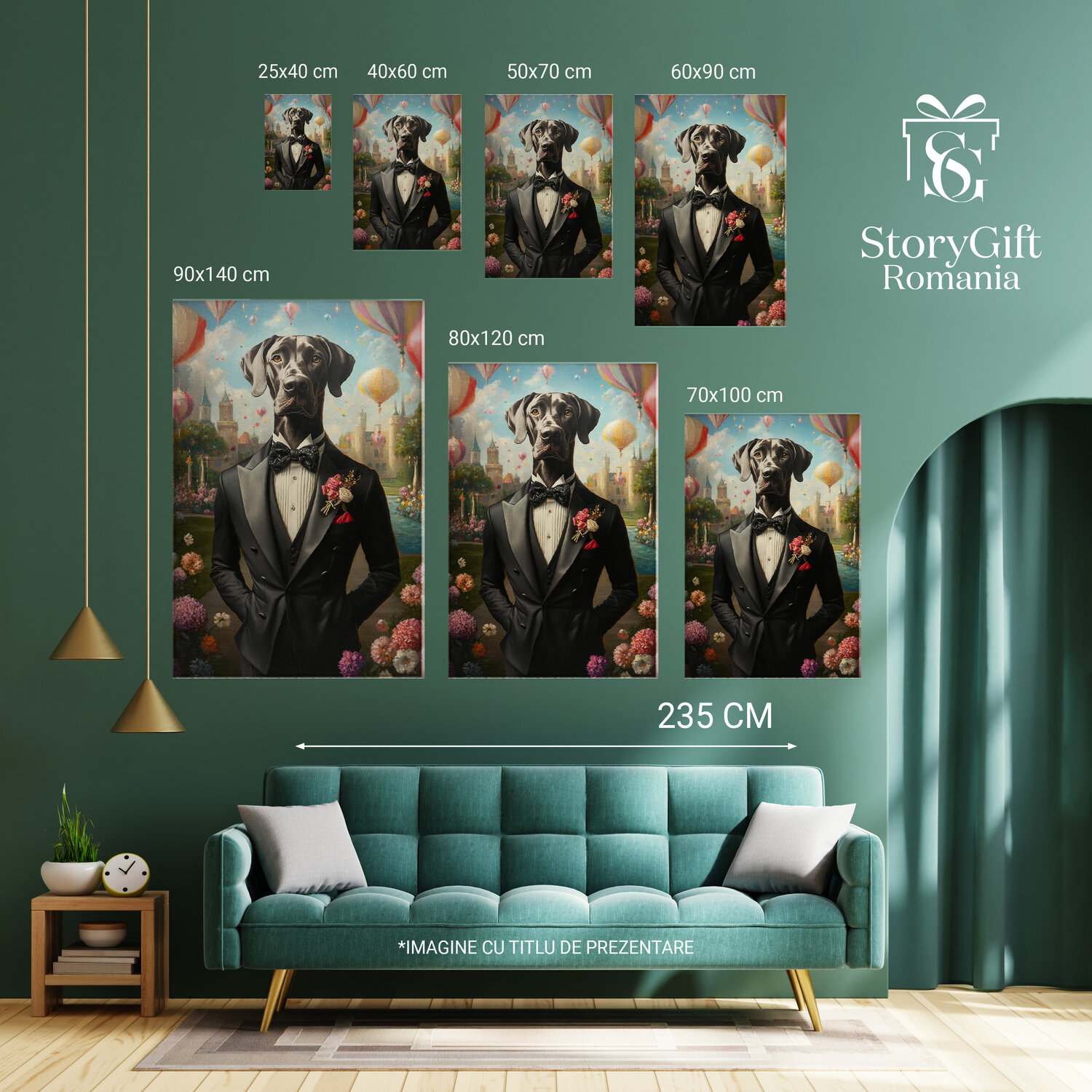 Tablou Canvas Personalizat Sarbatoare valentine's Day, tinuta masculina eleganta, cu papion si flori roz, baloane romantice cu aer cald, ziua indragostitilor, iubire 40x25CM