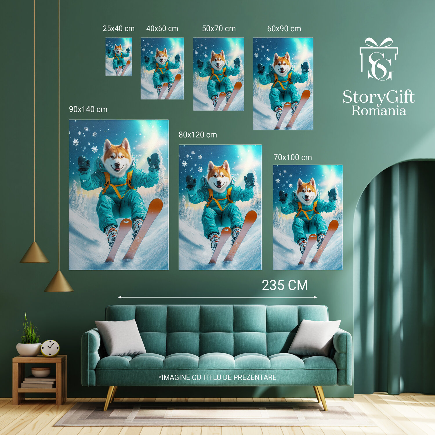 Tablou Canvas Personalizat Sport De Iarna, Sportiv Pe Schiuri In Salopeta Albastra Turcuaz, Aurora Boreala Pe Munte 140x90CM