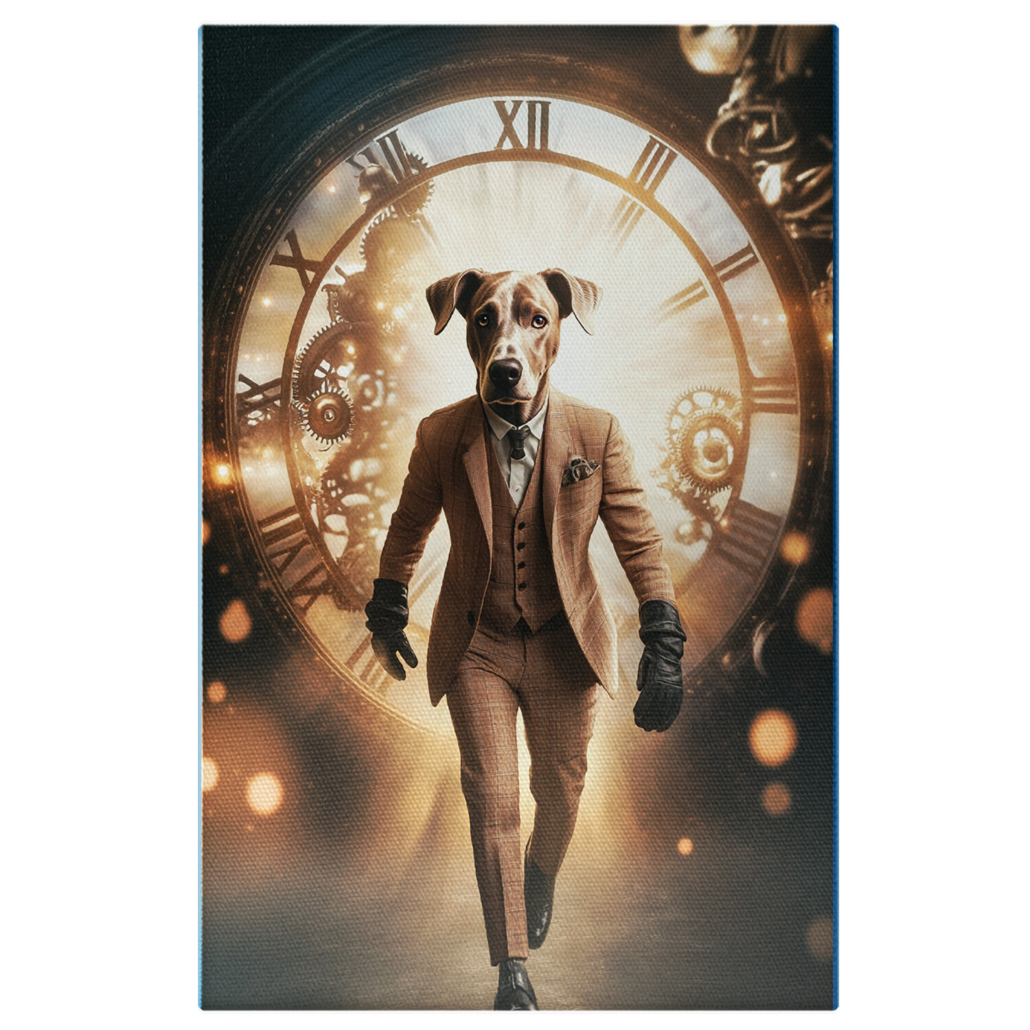 Tablou Canvas Personalizat Tinuta Office style, Costum Bej In Carouri Cu Camasa Alba si cravata Manusi DE Piele, Ceas Ilustrand trecerea Timpului 40x25CM