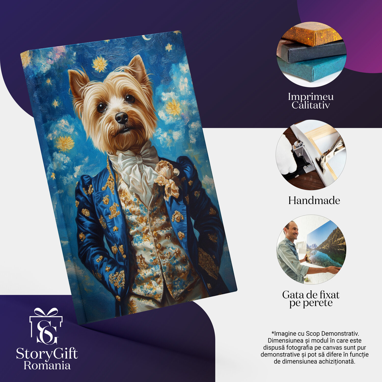 Tablou Canvas Personalizat Tinuta Regala Cu Detalii Florale Jupon Albastru, Vesta CU Butoni auri, Guler Inalt Stil Ruff 140x90CM