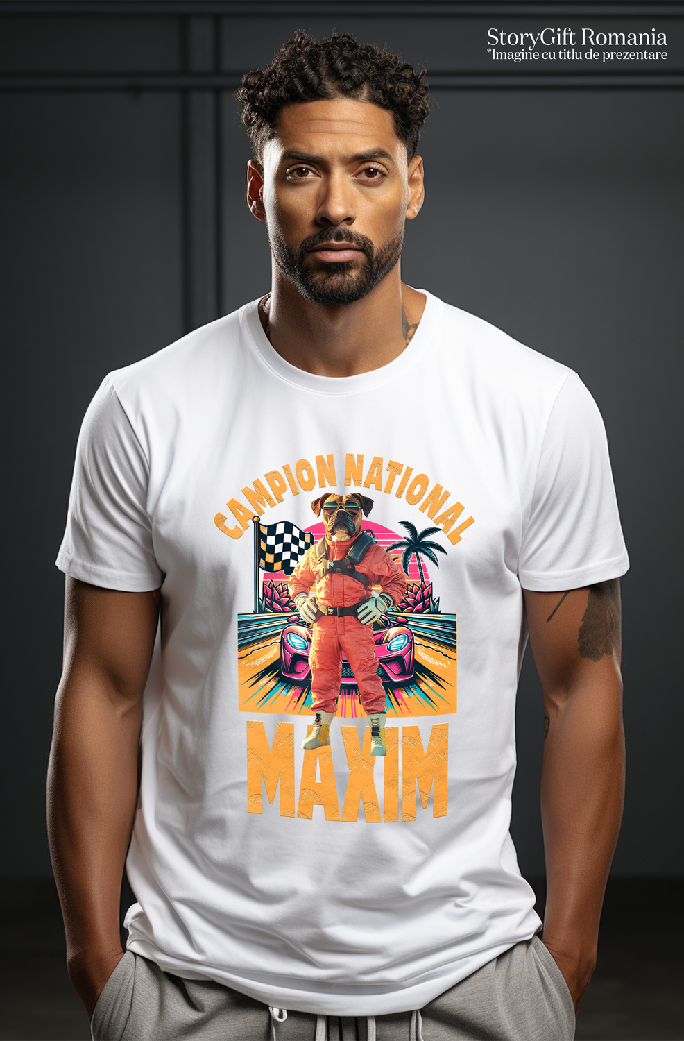 Tricou Barbati cu Animal Campion la Cursele cu Masini, Peronalizata cu Numele si Poza Animalului Tau cu imprimeu pe Fata, 100% Bumbac, Alb, XS