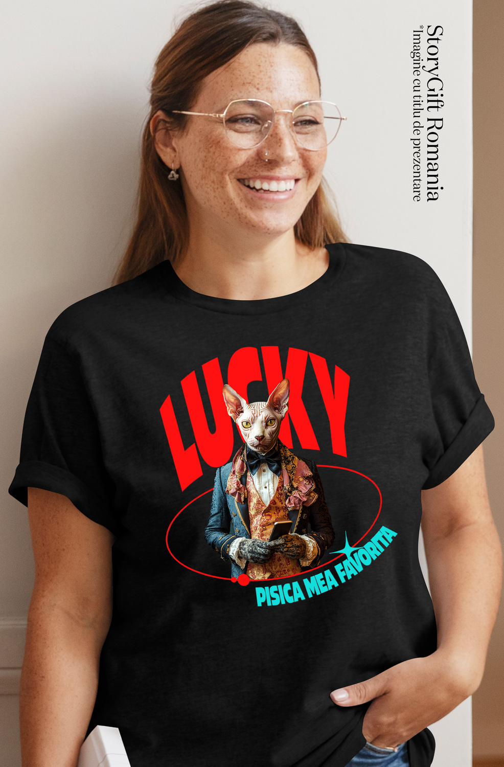 Tricou Femei cu Animal in Costum Regal, cu Manusi si Telefonul in Mana, Peronalizata cu Numele si Poza Animalului Tau cu imprimeu pe Fata, 100% Bumbac, Negru, XS