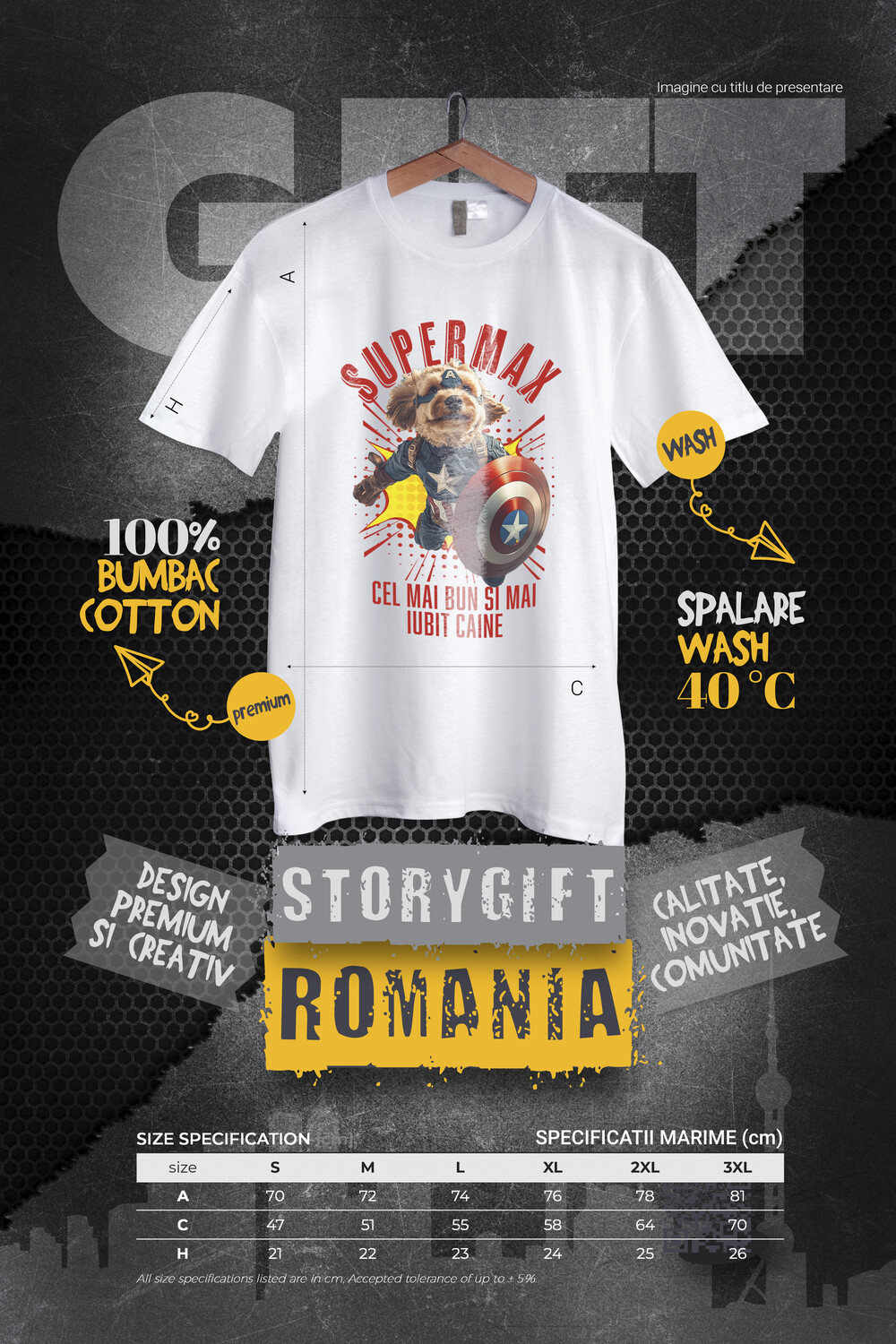 Tricou Barbati cu Animal In Costumul lui Capitanul America, Zburand, Scut, Peronalizata cu Numele si Poza Animalului Tau cu imprimeu pe Fata, 100% Bumbac, Alb, S