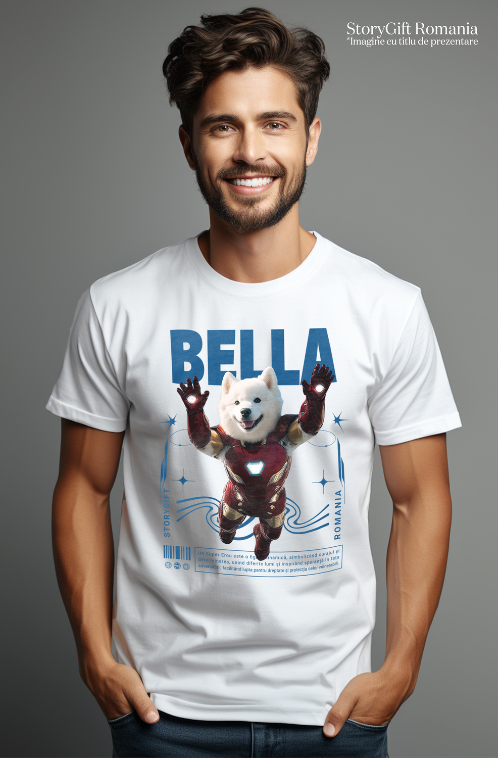 Tricou Barbati cu Animal In Costumul lui Ironman, Zburand, Peronalizata cu Numele si Poza Animalului Tau cu imprimeu pe Fata, 100% Bumbac, Alb, XS