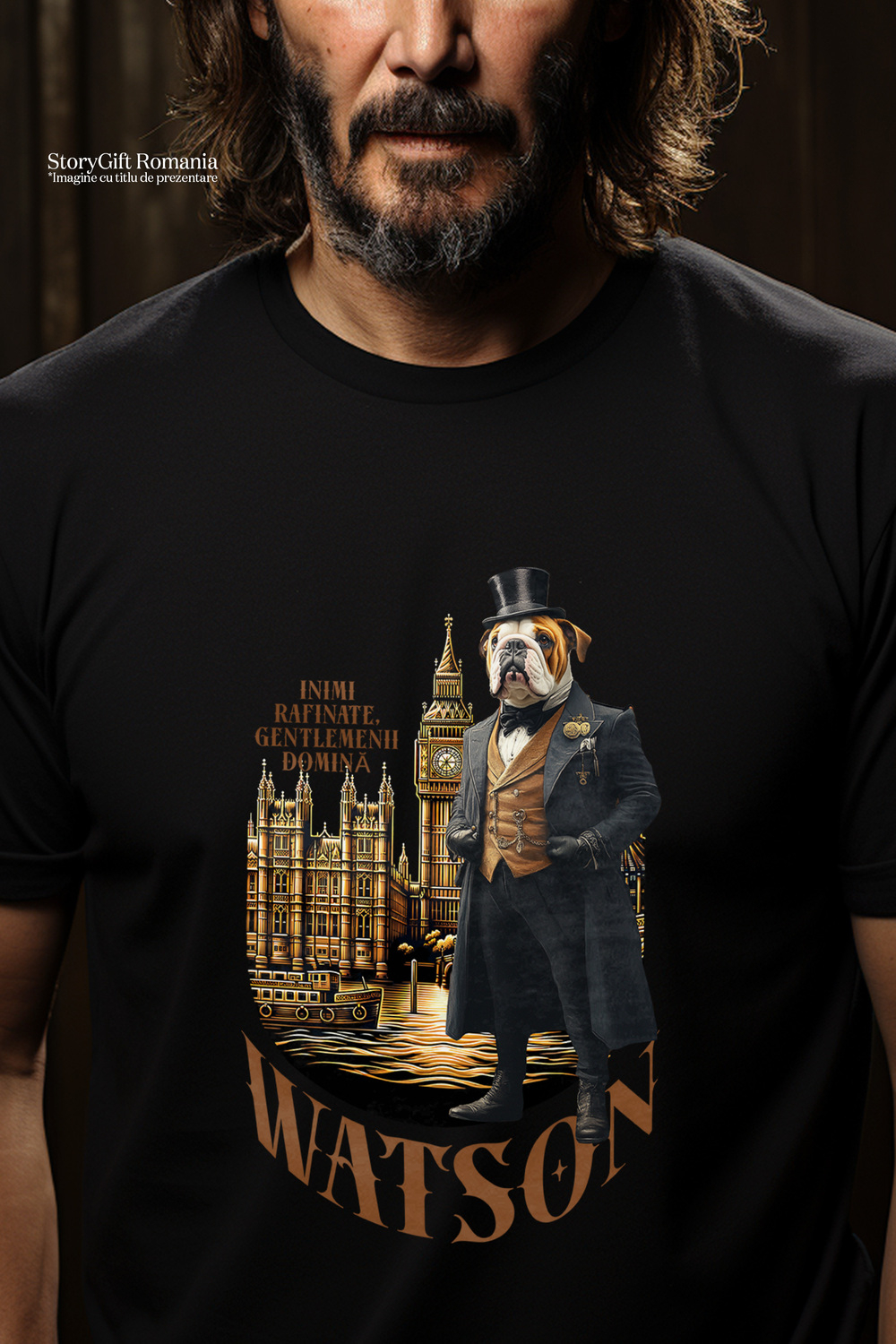 Tricou Barbati cu Animal in Costumul Regal din Londra, Peronalizata cu Numele si Poza Animalului Tau cu imprimeu pe Fata, 100% Bumbac, Negru, XS