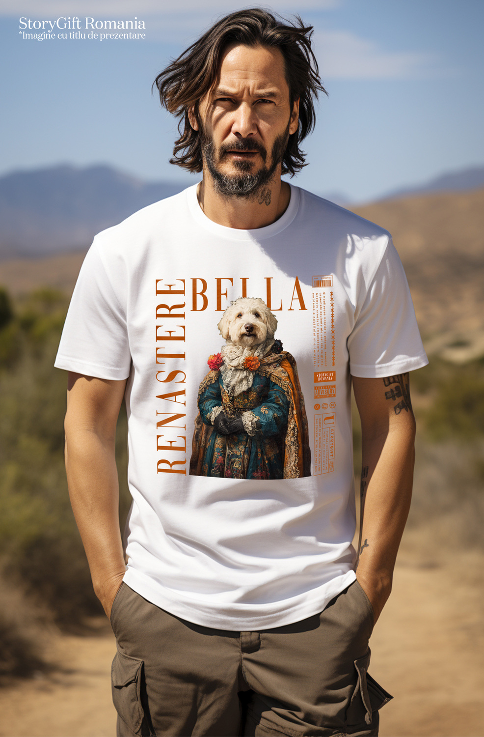 Tricou Barbati cu Animal in Vesmant Regal Renascentist, Peronalizata cu Numele si Poza Animalului Tau cu imprimeu pe Fata, 100% Bumbac, Alb, XS