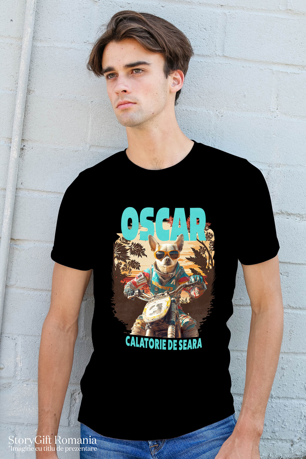 Tricou Barbati cu Animal Pe Motocicleta, Enduro, Motocross, Peronalizata cu Numele si Poza Animalului Tau cu imprimeu pe Fata, 100% Bumbac, Negru, S