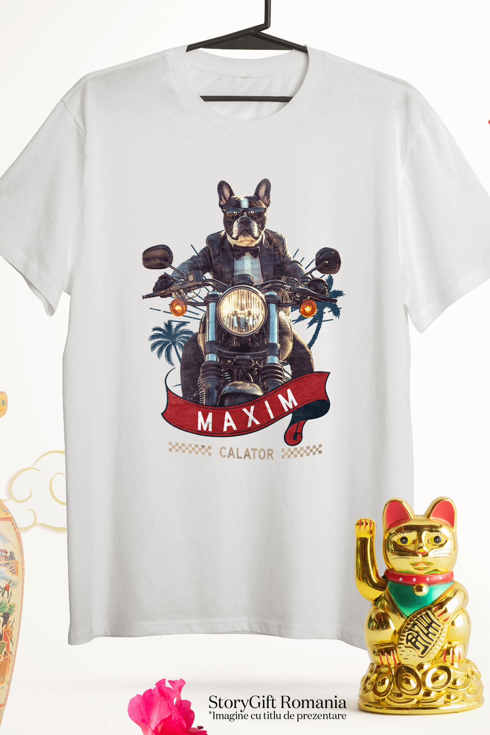 Tricou Barbati cu Animal Pe Motocicleta in Costum, Peronalizata cu Numele si Poza Animalului Tau cu imprimeu pe Fata, 100% Bumbac, Alb, XS