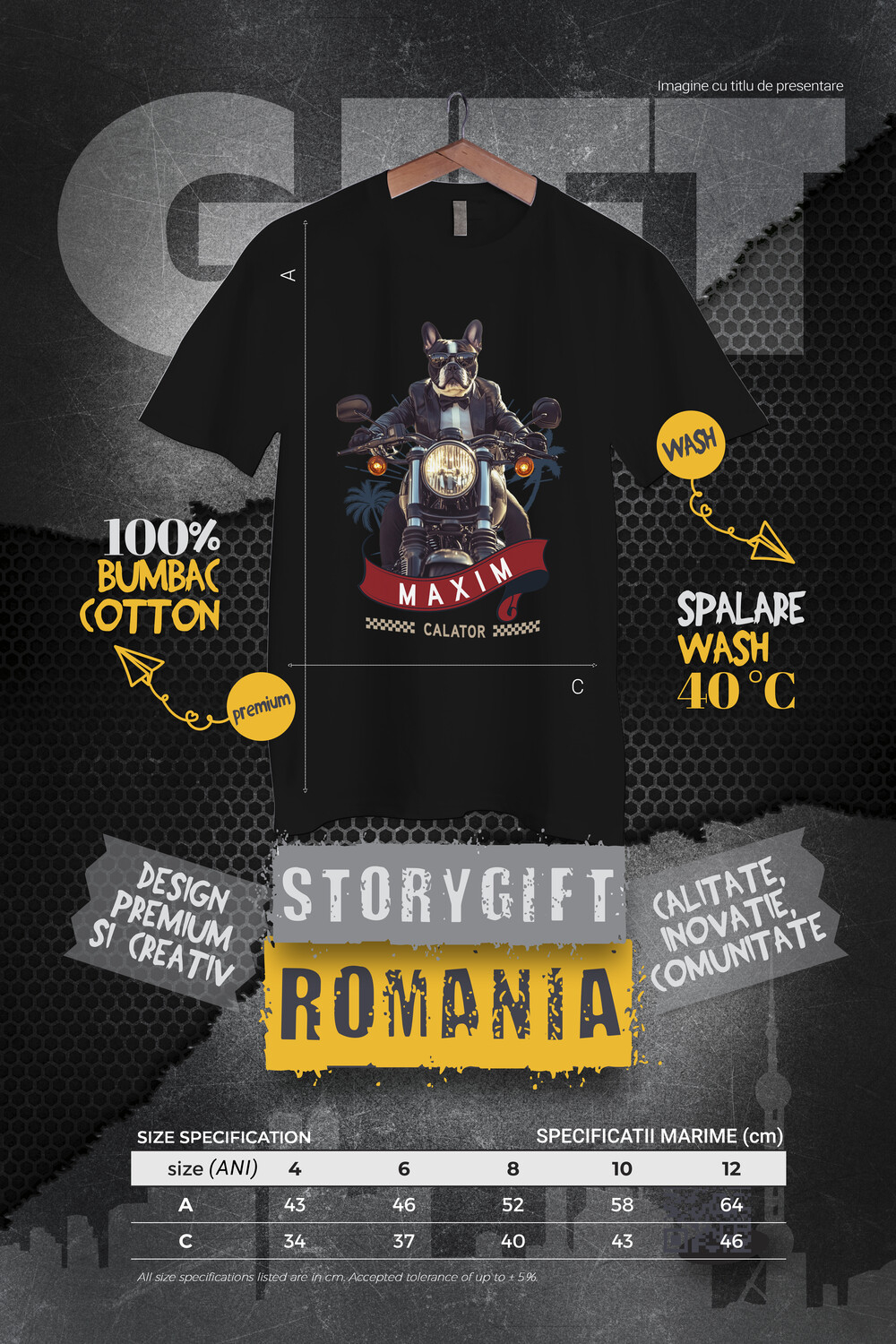 Tricou Copii cu Animal Pe Motocicleta in Costum, Peronalizata cu Numele si Poza Animalului Tau cu imprimeu pe Fata, 100% Bumbac, Negru, 10 Ani