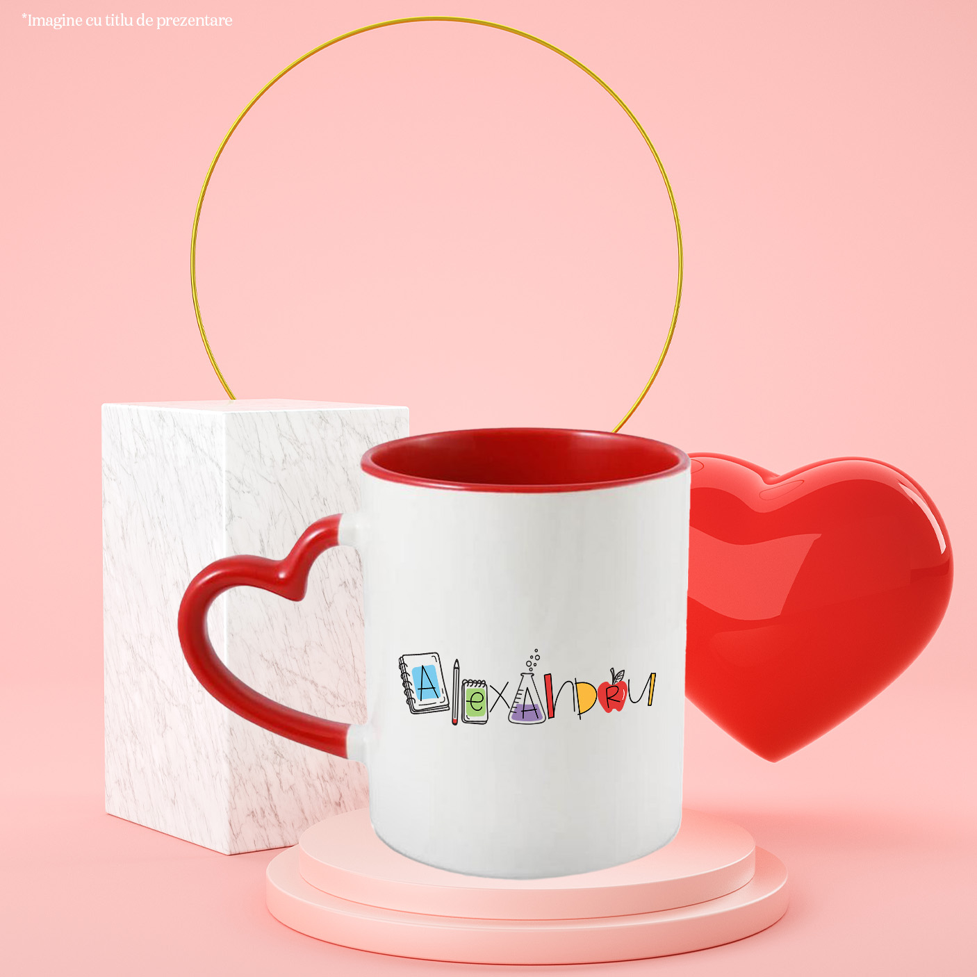 Cana Cu Numele Alexandru, si Mesaj Amuzant, Curios, Sociabil, Galagio, 330ml, Ceramica cu Maner Inima Rosie