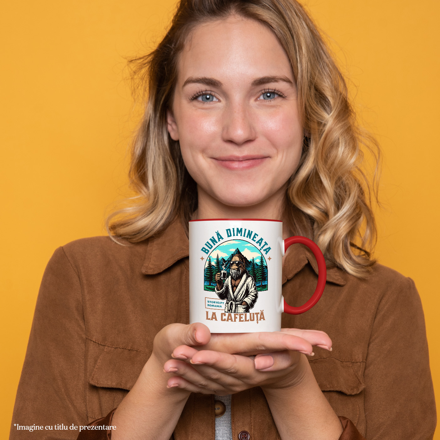 Cana Gorila in halat savurand cafeaua de dimineata, 330ml, Ceramic cu Maner Rosu