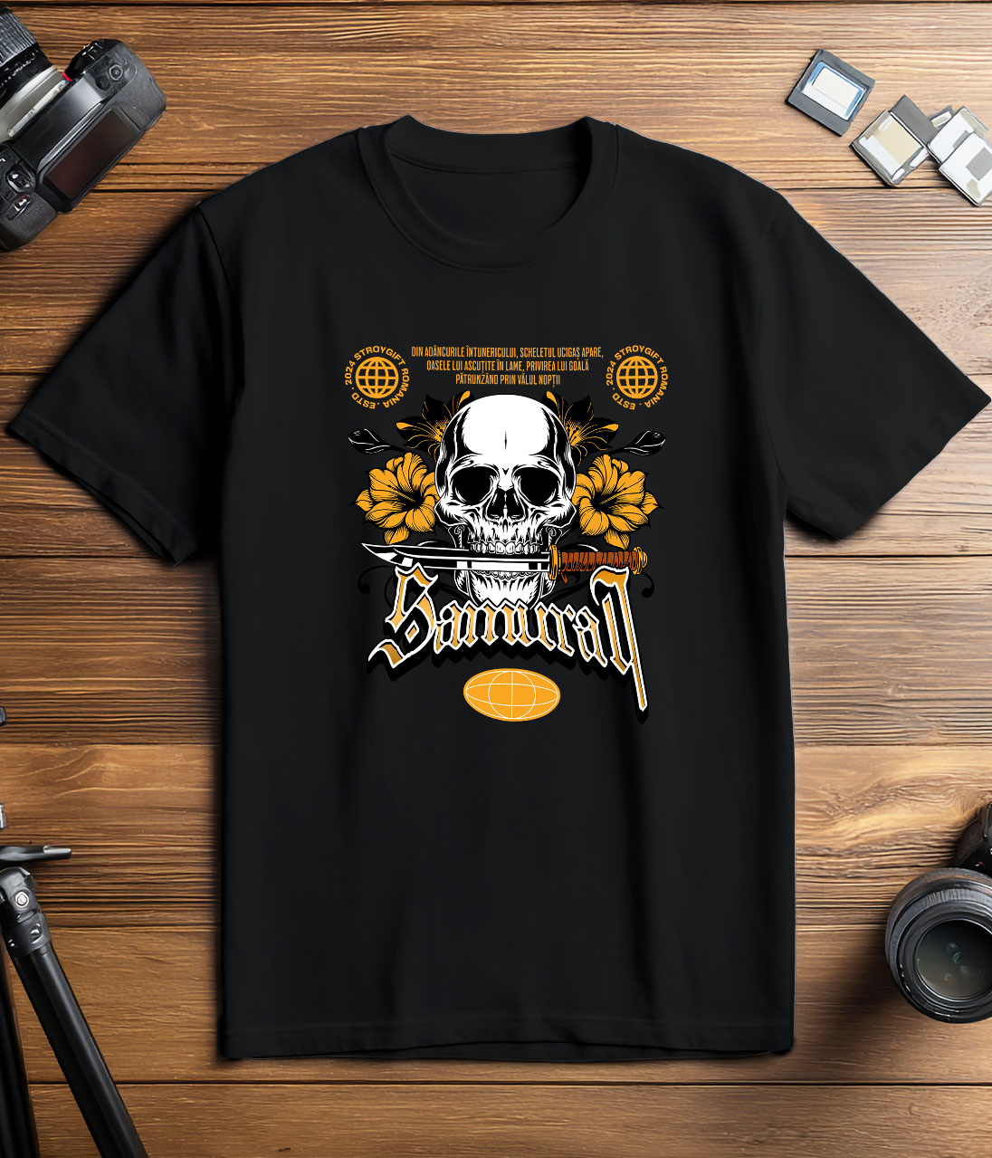 Tricou Barbati cu Craniu Uman Cu Cutit Flori Colorate Samurai, Razboinici cu imprimeu pe Fata, 100% Bumbac, Negru, L