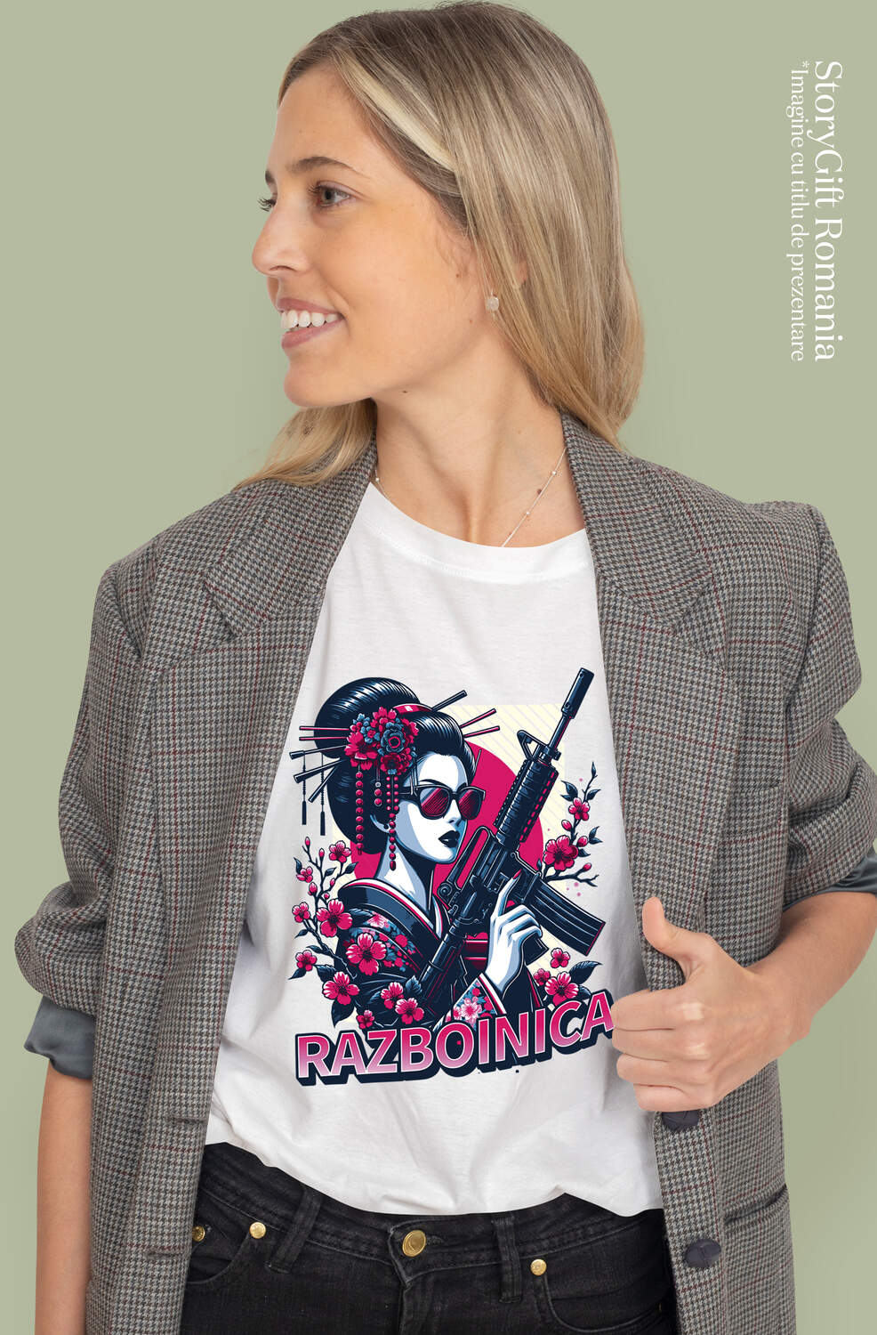 Tricou Femei cu Fata Asiatica Stil Mafiot Cu Mitraliera Flori Roz Razboinica cu imprimeu pe Fata, 100% Bumbac, Alb, M