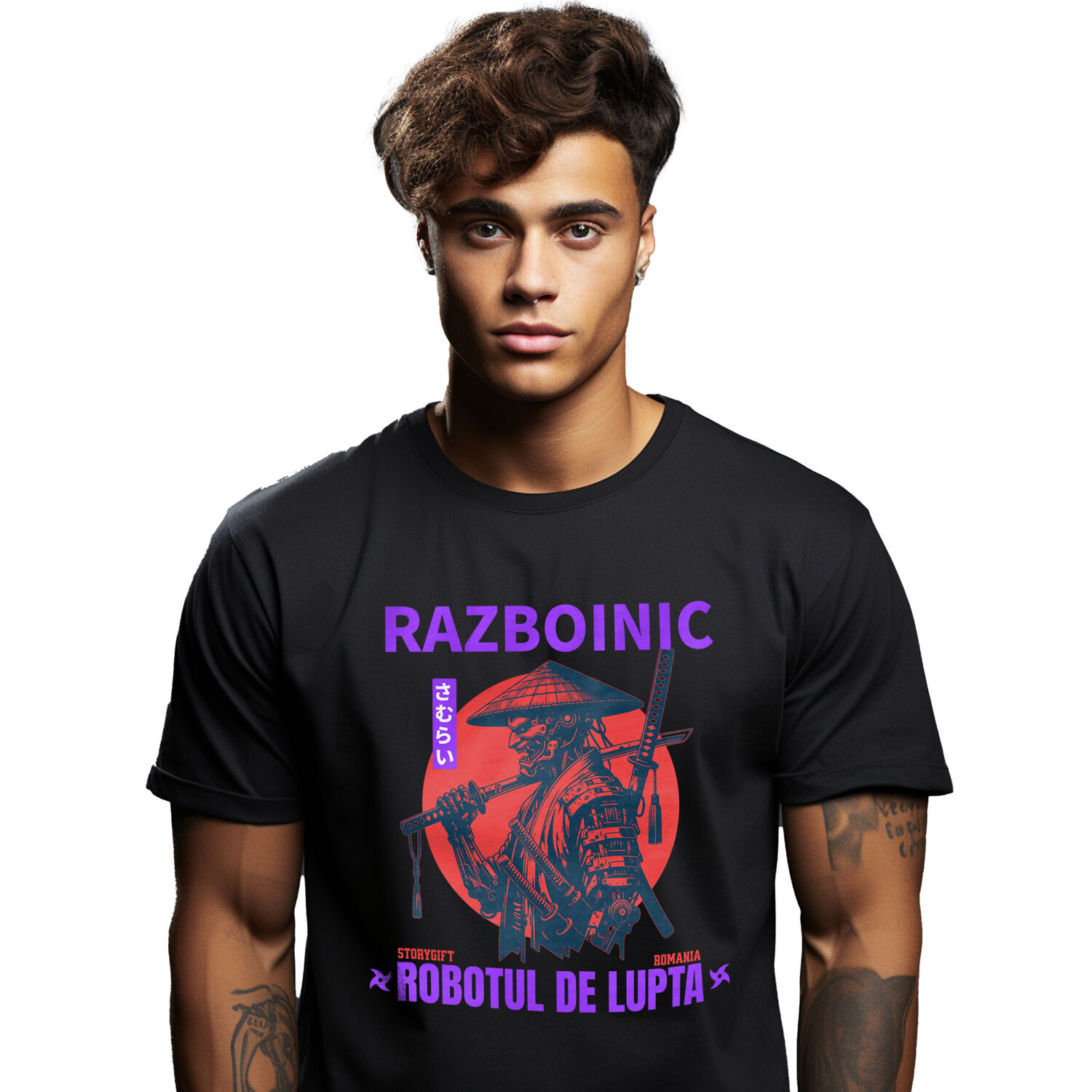Tricou Barbati cu Portret Profil Razboi Robot Cu Palarie Stil Samurai Ninja cu imprimeu pe Fata, 100% Bumbac, Negru, L