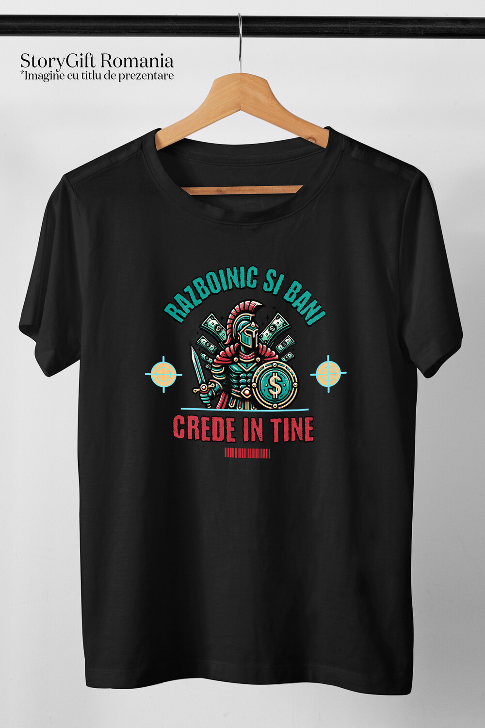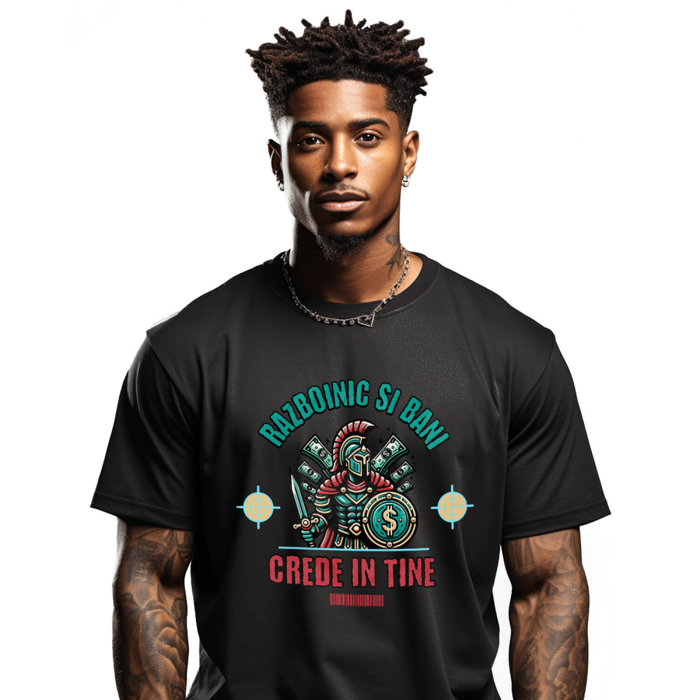Tricou Barbati cu Razboinic Cavaler Cu Scut Si Sabie Bancnote Bani Semn Dolar cu imprimeu pe Fata, 100% Bumbac, Negru, L