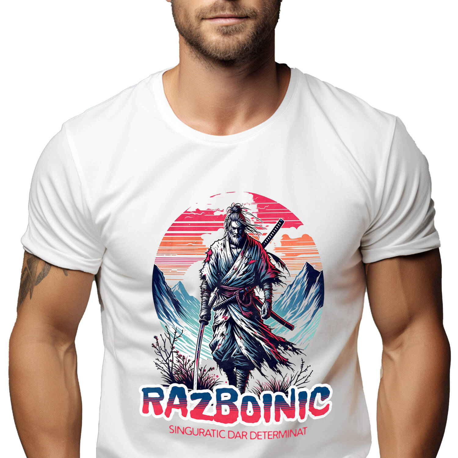 Tricou Barbati cu Razboinic Stil Asiatic Pe varf De Munte Cu Sabie Apus De Soare cu imprimeu pe Fata, 100% Bumbac, Alb, M