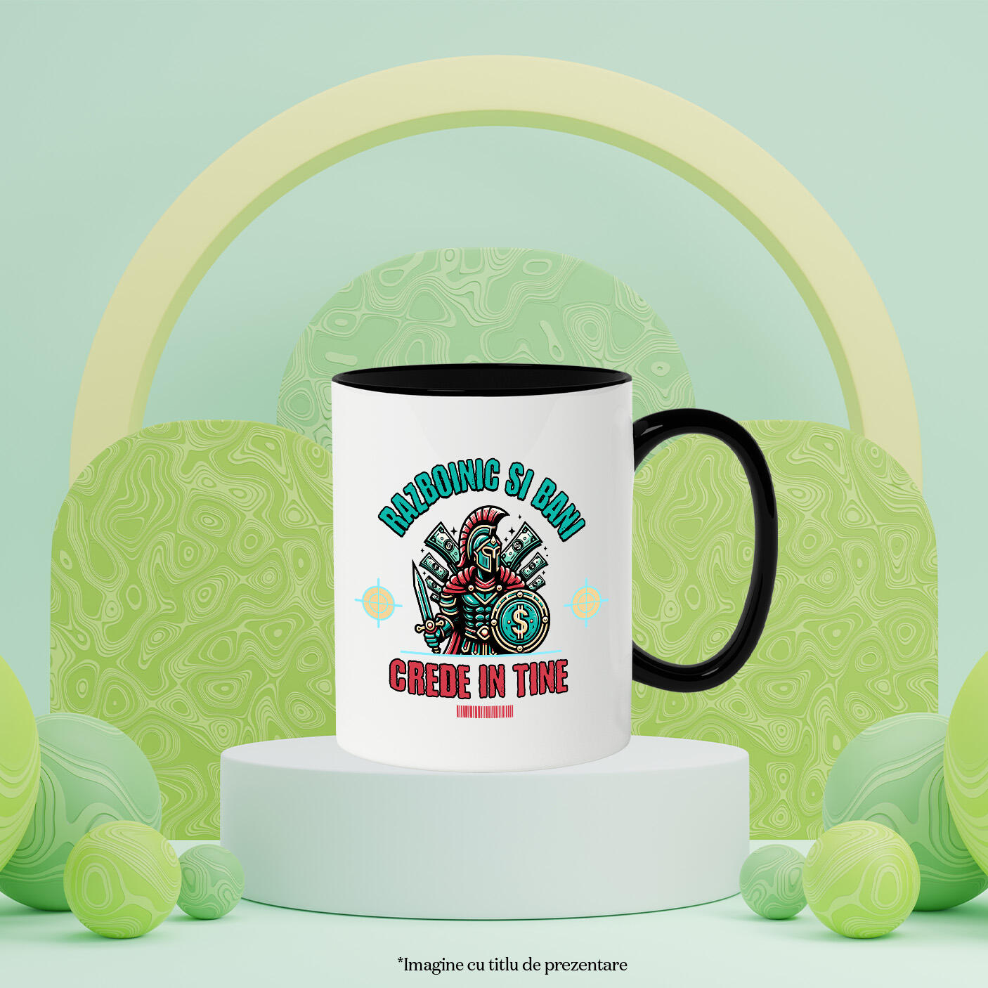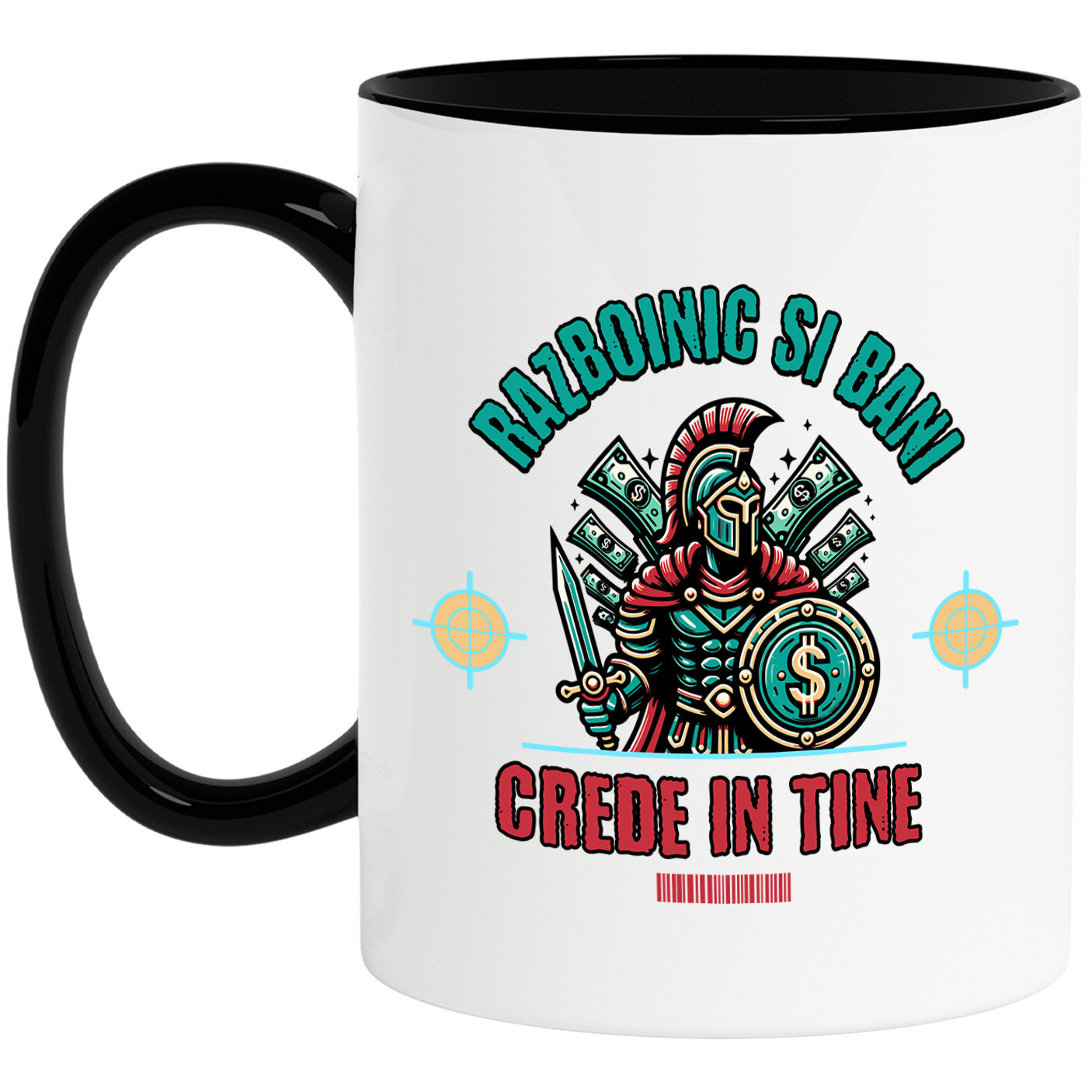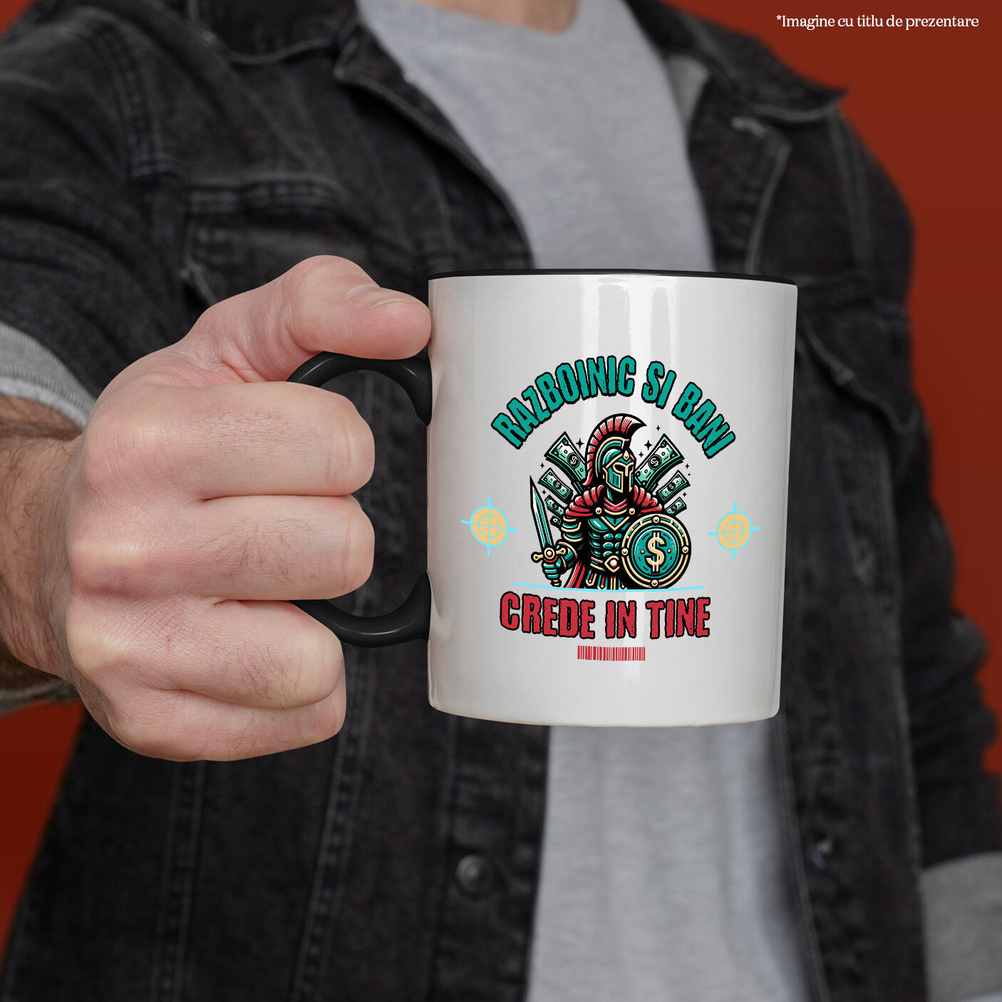 Cana Personalizata cu Razboinic Cavaler Cu Scut Si Sabie Bancnote Bani Semn Dolar , Ceramica, 330ML, cu Maner Negru