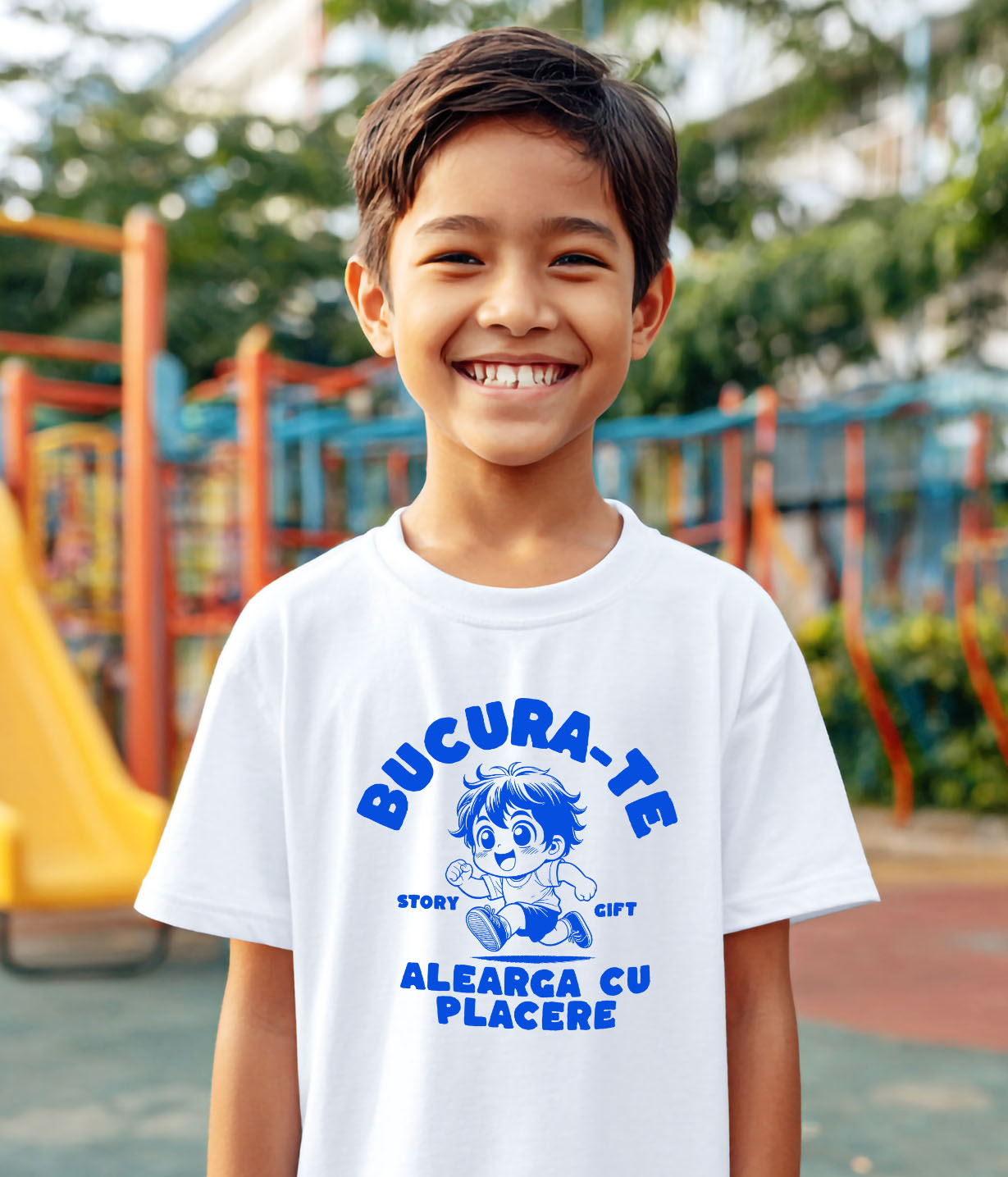 Tricou Copii cu Baiat Vesel Alergare Sport Maraton Sanatate Motivational cu imprimeu pe Fata, 100% Bumbac, Alb, 6 Ani