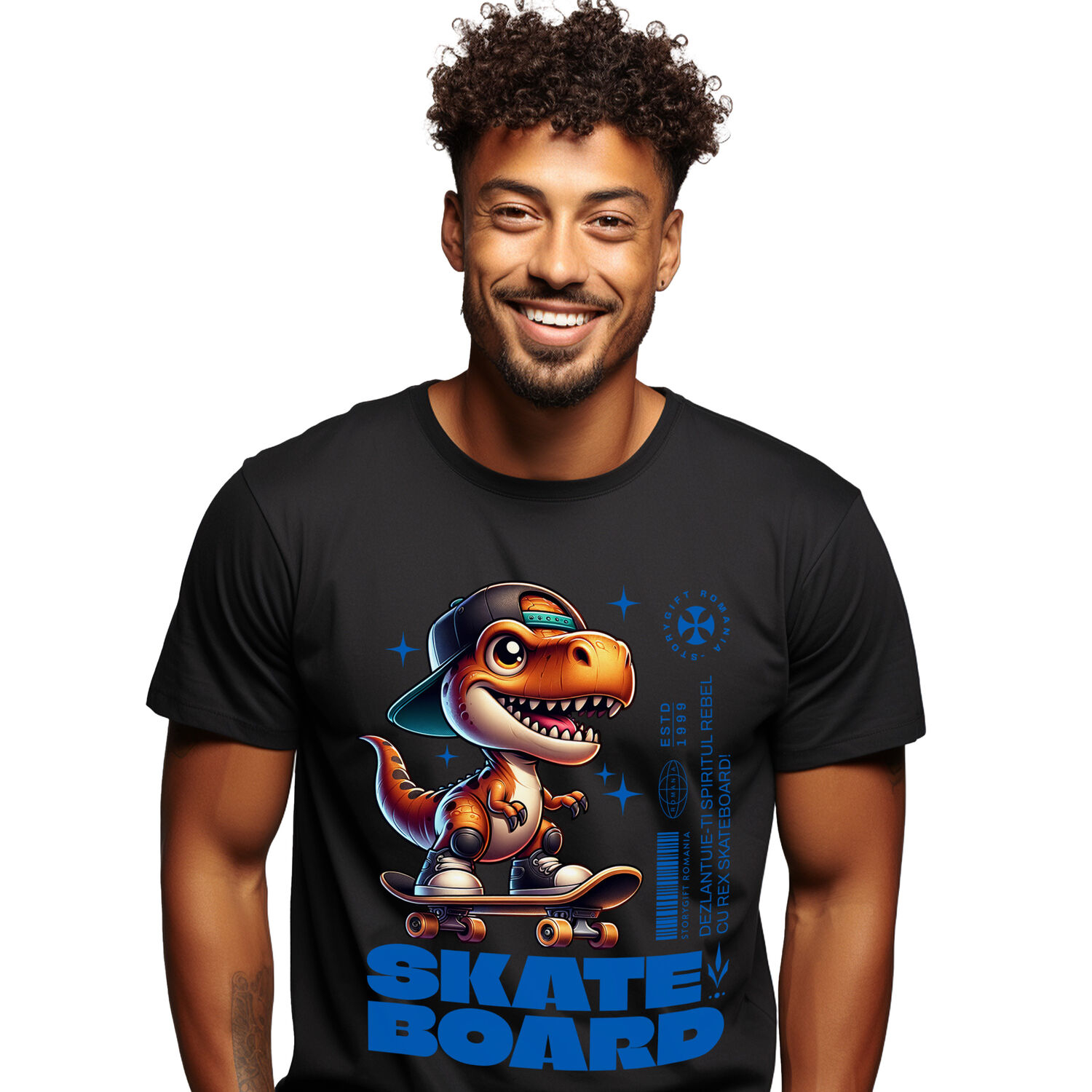Tricou Barbati cu Dinozaur Cu Sapca Vesel Pe Placa De Skateboard Text In Limba Romana cu imprimeu pe Fata, 100% Bumbac, Negru, L