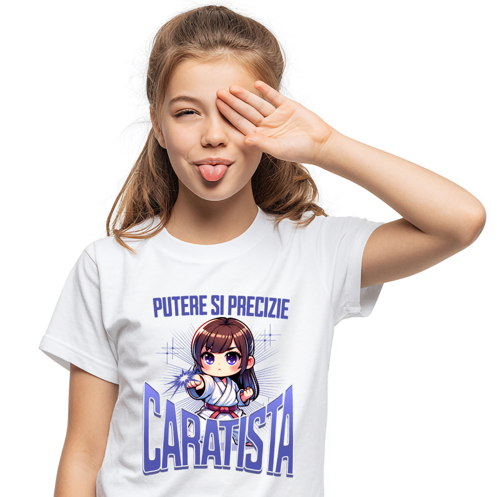 Tricou Copii cu Fata Stiul Anime Cu Ochii Mov Tinuta Karate Putere Caratista cu imprimeu pe Fata, 100% Bumbac, Alb, 4 Ani