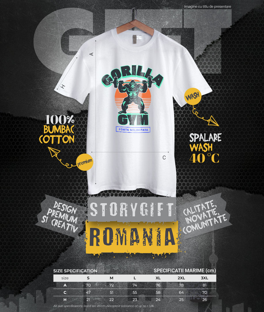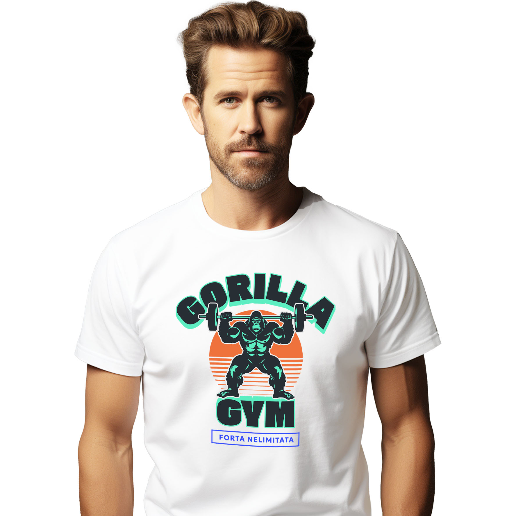 Tricou Barbati cu Gorila Sportiva Ridicari Gantere Greutati Sala Forta Nelimitata cu imprimeu pe Fata, 100% Bumbac, Alb, L