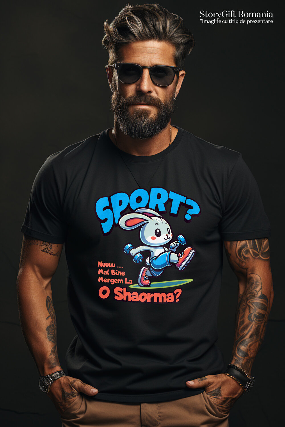 Tricou Barbati cu Iepure Sportiv Gri Cu Gantere Shaorma Dieta Haios cu imprimeu pe Fata, 100% Bumbac, Negru, L