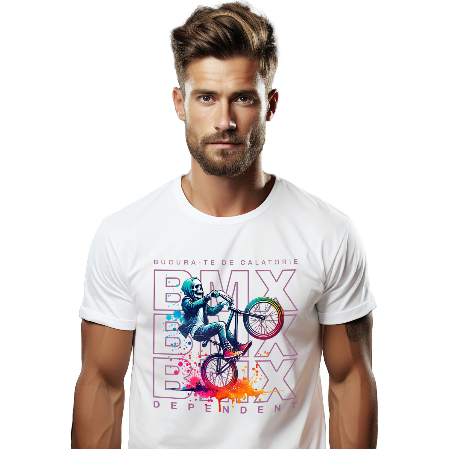 Tricou Barbati cu Schelete Pe BMX Schema Bicicleta Stil Stradal Motivational Bucura-te De Calatorie cu imprimeu pe Fata, 100% Bumbac, Alb, M