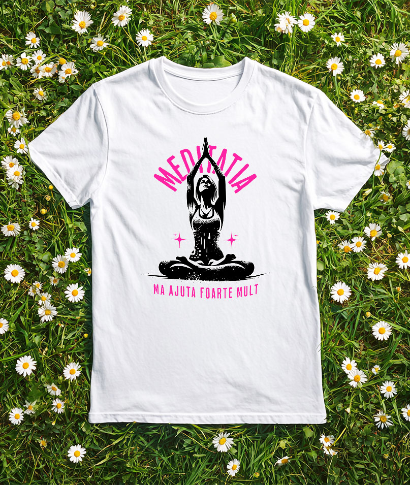 Tricou Femei cu Silueat Femeie pozitie Yoga Relaxare Meditatie Sport cu imprimeu pe Fata, 100% Bumbac, Alb, M