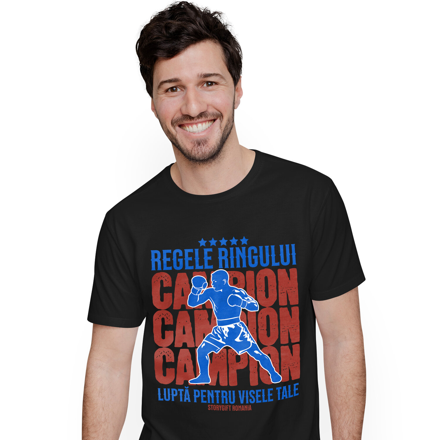 Tricou Barbati cu Silueta Umana Jucator De Sport Box Contact Motivational Regele Ringului cu imprimeu pe Fata, 100% Bumbac, Negru, XL