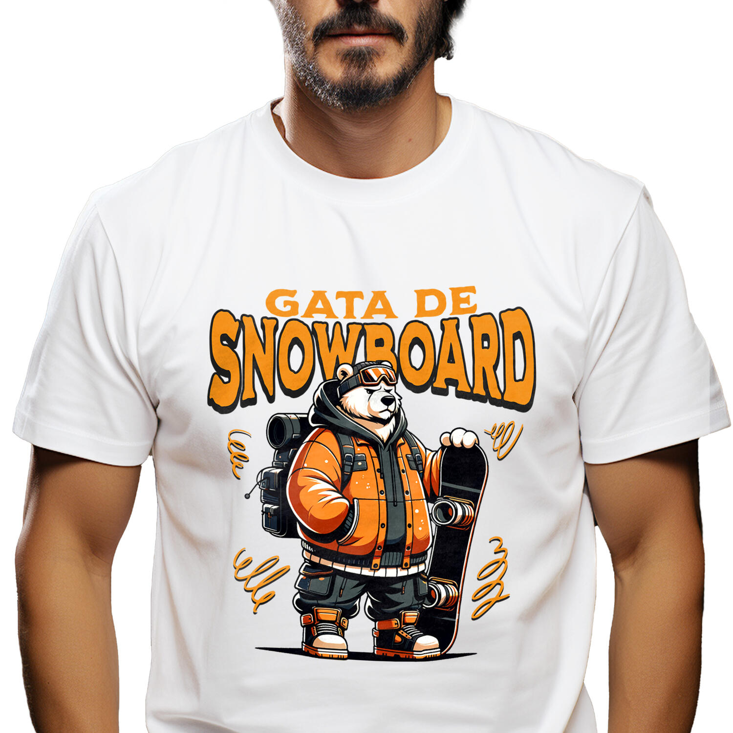 Tricou Barbati cu Urs Polar Tinuta modernaIarna Sport Placa De Snowboard cu imprimeu pe Fata, 100% Bumbac, Alb, L