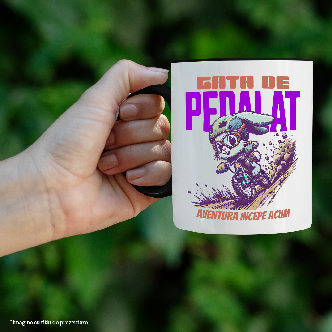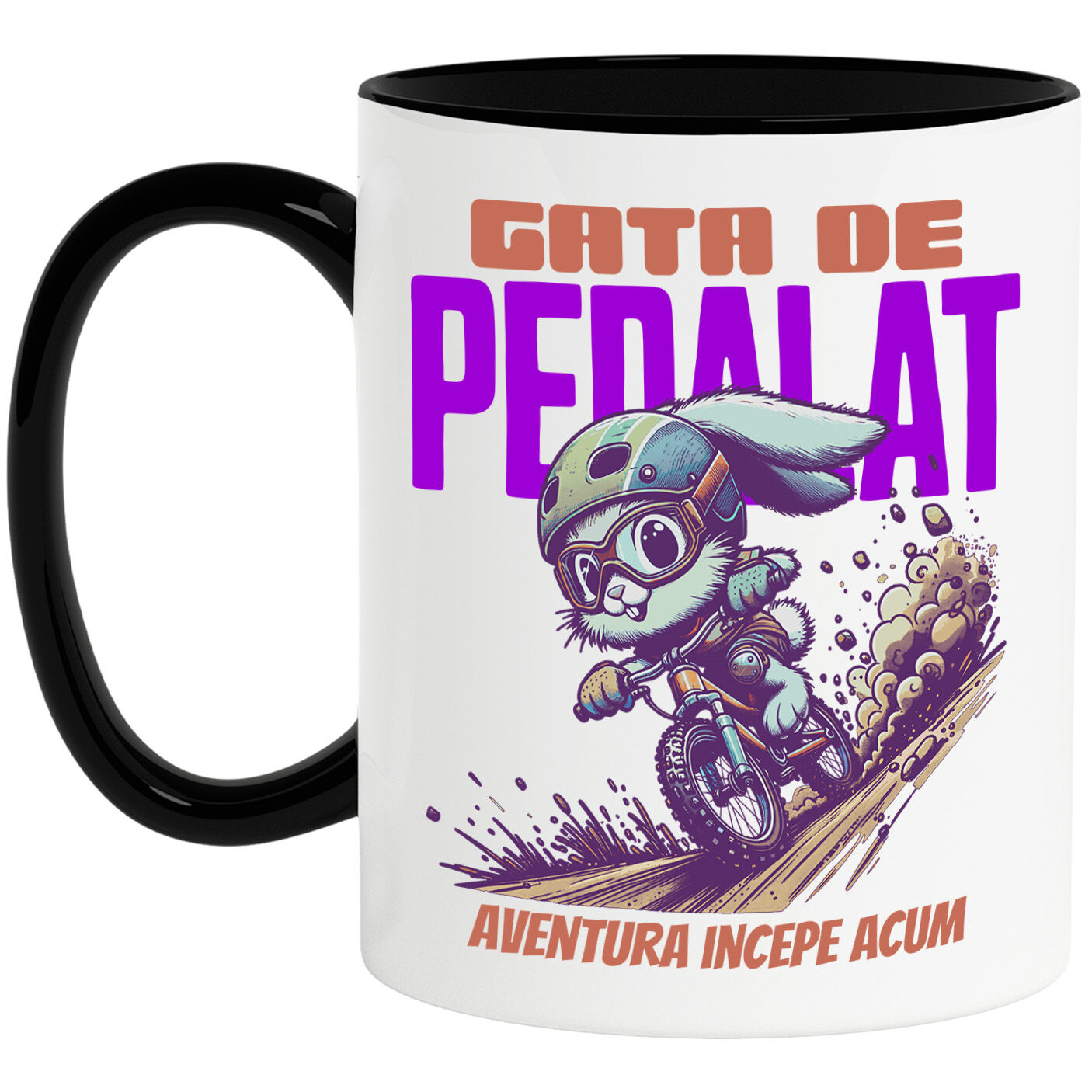 Cana Personalizata cu Iepure Cu Echipament Protectie Ochelari Haios Pe Bicicleta Aventura incepe Acum Gata De Pedalat, Ceramica, 330ML, cu Maner Negru