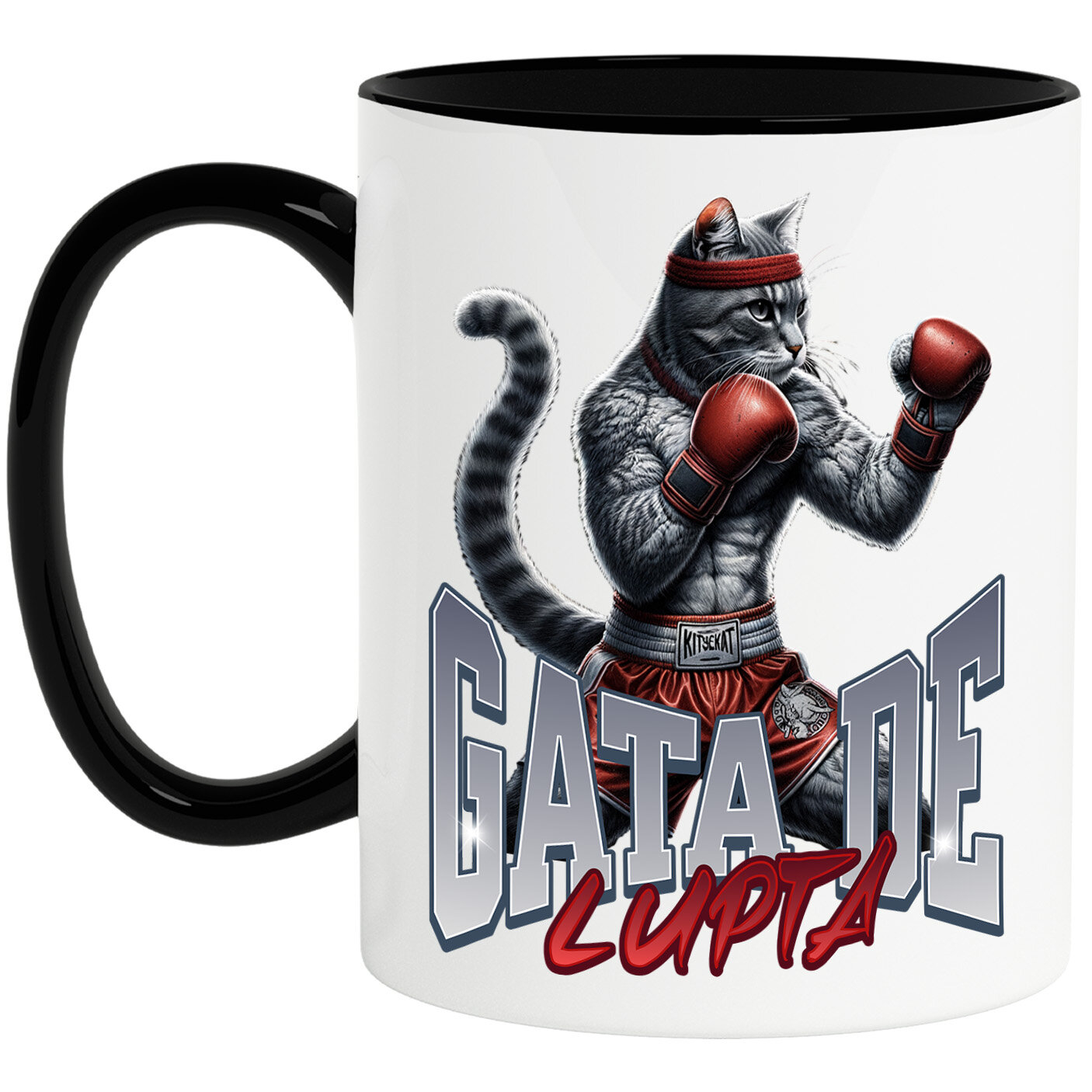 Cana Personalizata cu Pisica Motan Gri Cu Manusi Si Echipament Rosu Box Sport De Contact Motivational, Ceramica, 330ML, cu Maner Negru