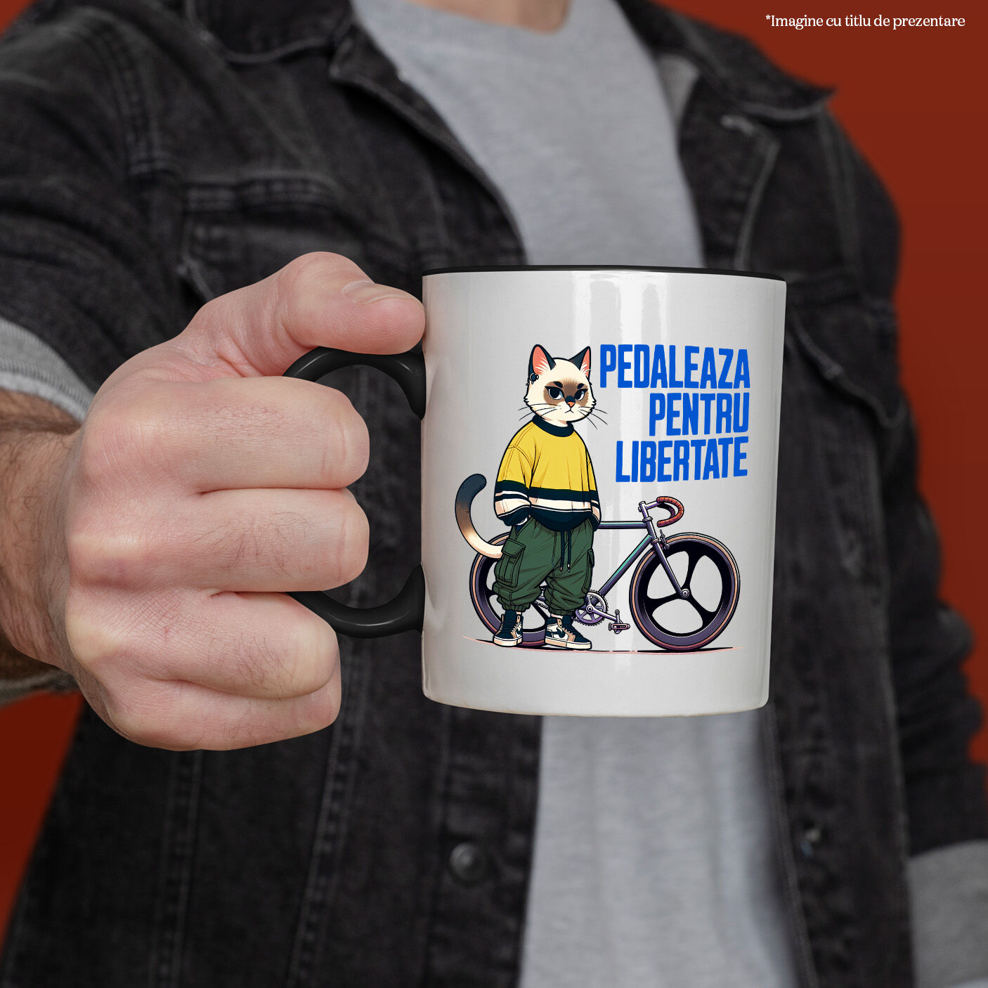 Cana Personalizata cu Pisivca Tinuta moderna Cu Bicicleta Plimbare Relaxare Sport , Ceramica, 330ML, cu Maner Negru