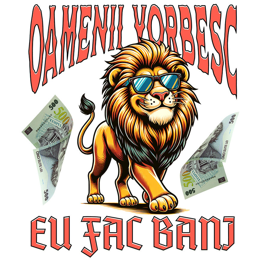 Sticker Personalizat cu Regele Leu Cu Ochelari De Soare bancnote In Aer de 500 Lei cu Margini Albe, PVC Vinyl 10 cm