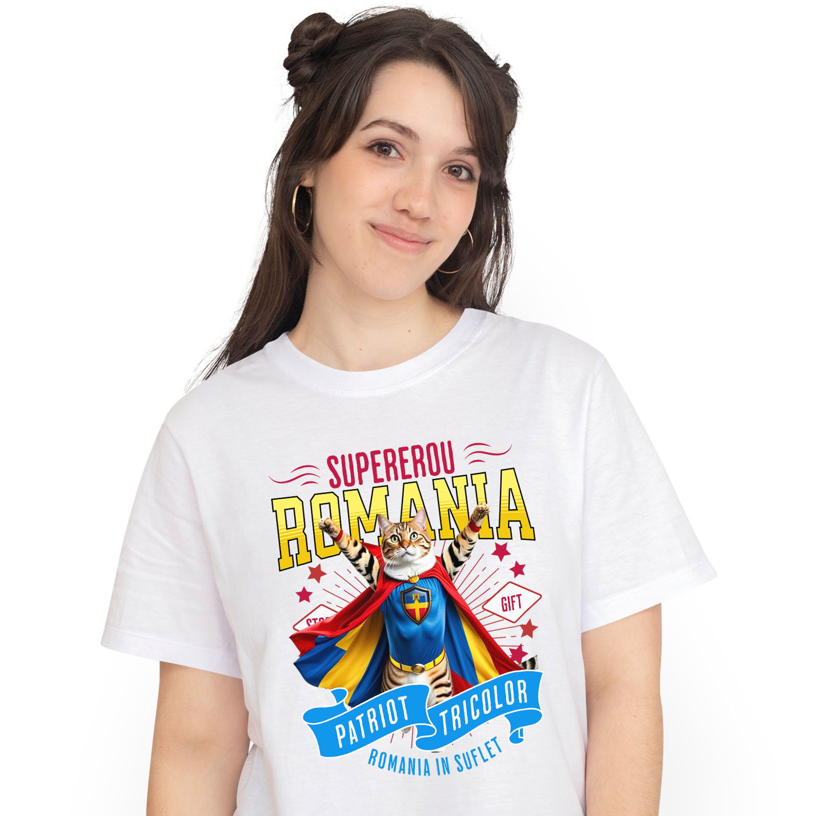 Tricou Femei cu Bengal Pisica In Costum de Capitan Romania cu Pelerina, Erou Nocturn, Desene animate, Copii, Iubitorii de Animale cu imprimeu pe Fata, 100% Bumbac, Alb, XL