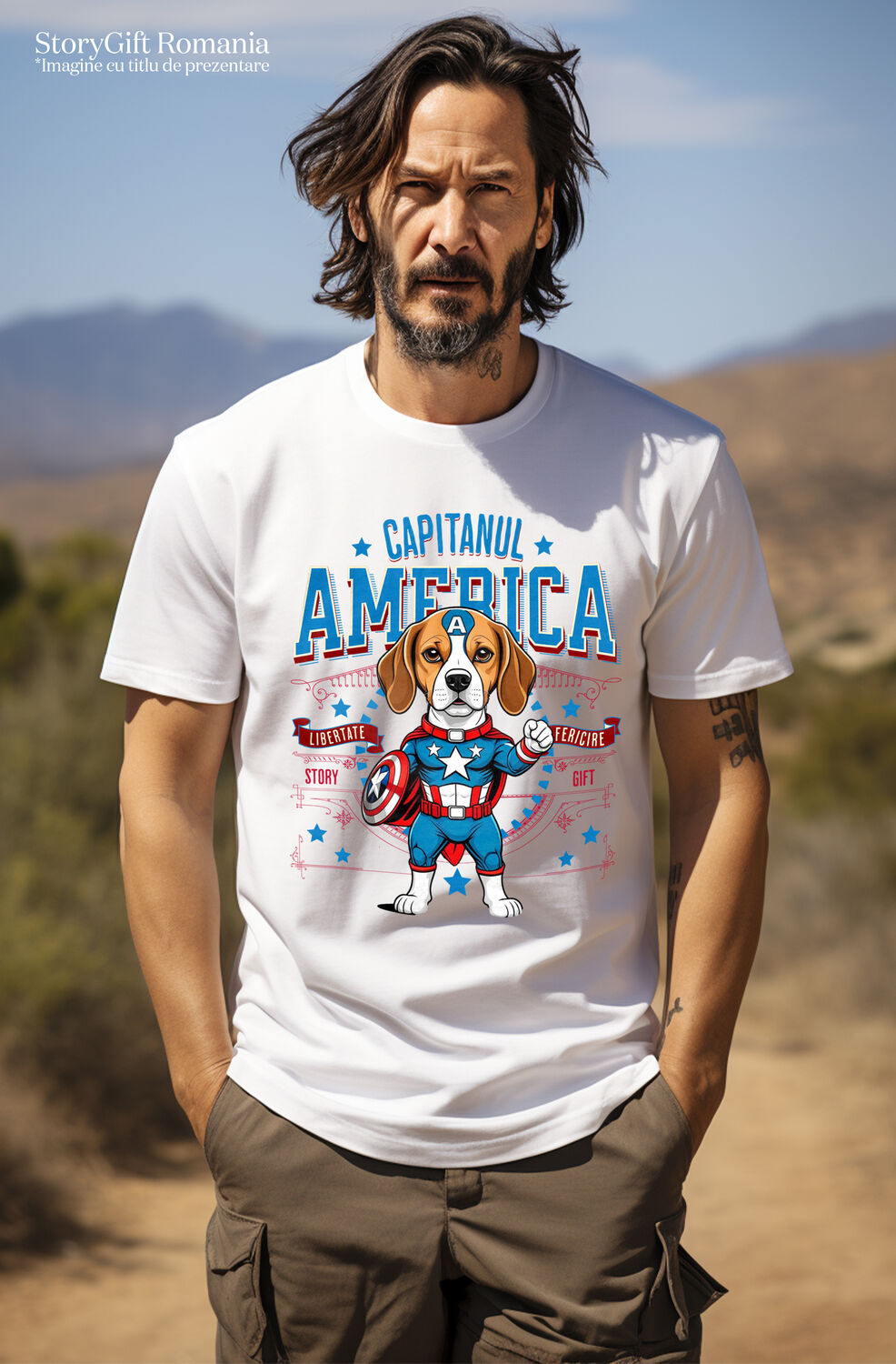 Tricou Barbati cu boxer Caine In Costum de Capitan America cu Pelerina, Erou Nocturn, Desene animate, Copii, Iubitorii de Animale cu imprimeu pe Fata, 100% Bumbac, Alb, XL