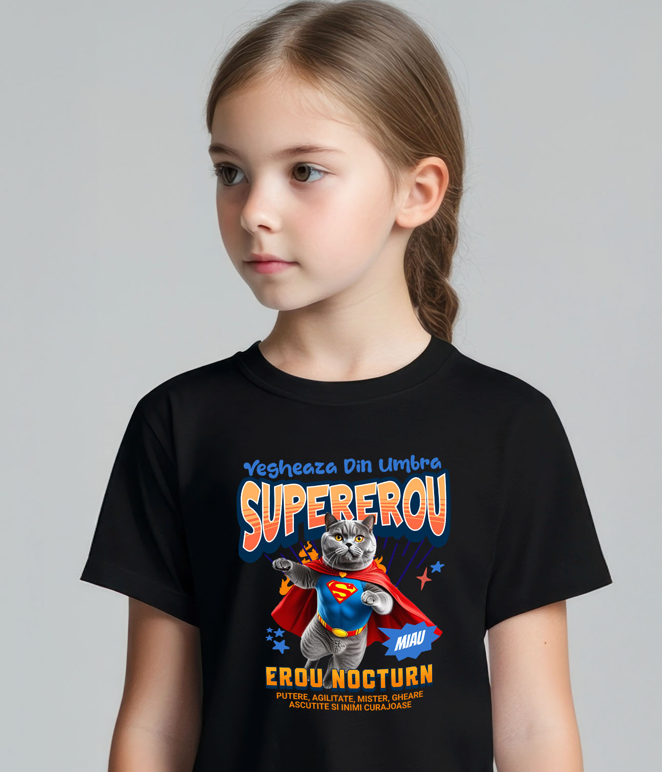 Tricou Copii cu British Shorthair Caine In Costum de SuperMan cu Pelerina, Erou Nocturn, Desene animate, Copii, Iubitorii de Animale cu imprimeu pe Fata, 100% Bumbac, Negru, 10 Ani