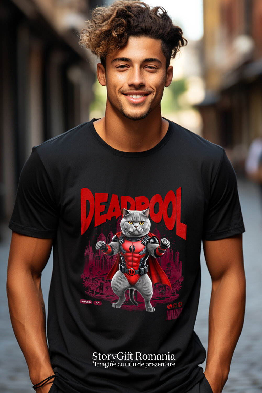 Tricou Barbati cu British Shorthair Pisica In Costum de DeadPool cu Pelerina, Erou Nocturn, Desene animate, Copii, Iubitorii de Animale cu imprimeu pe Fata, 100% Bumbac, Negru, L