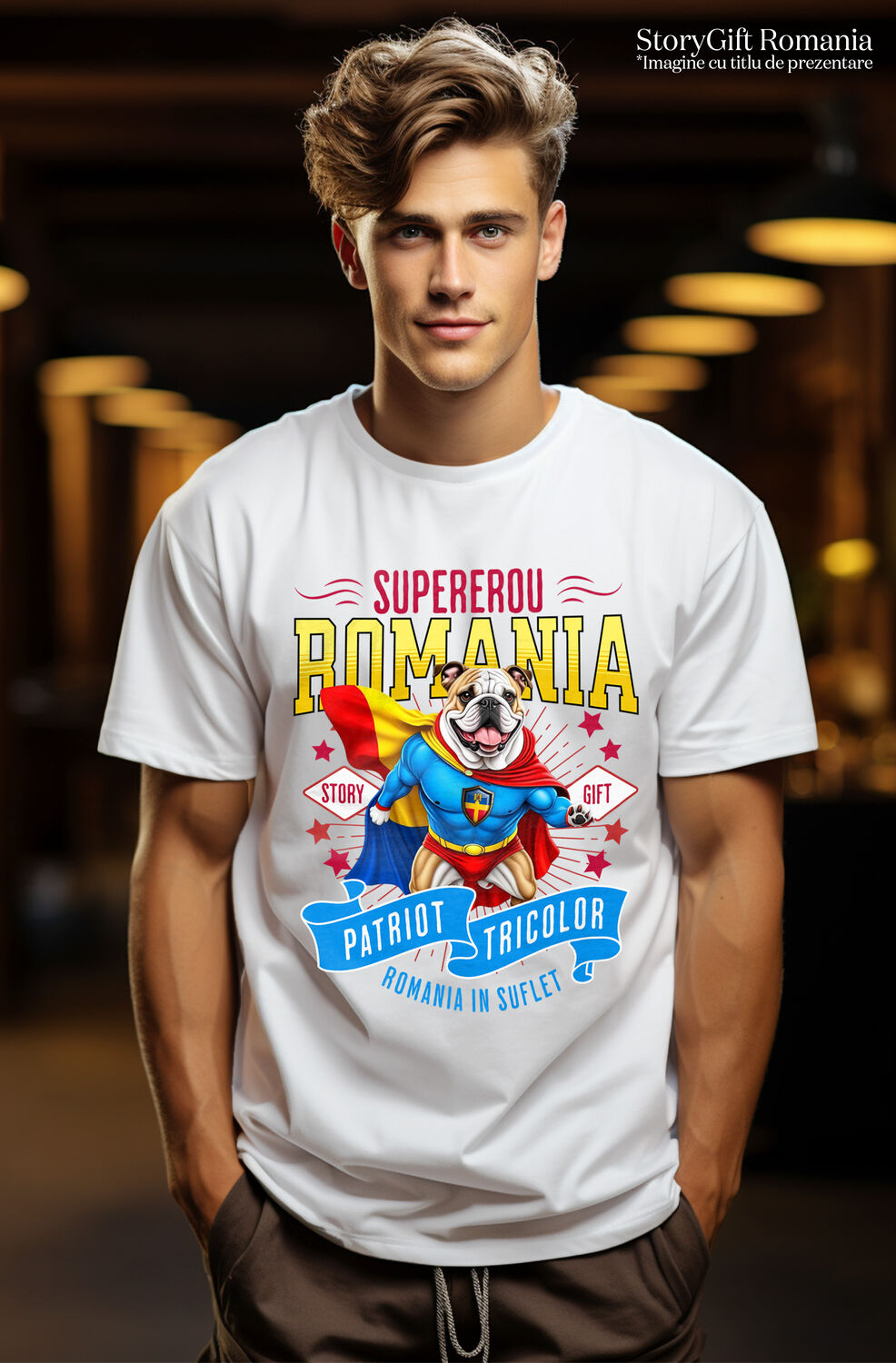 Tricou Barbati cu Bulldog Caine In Costum de Capitan Romania cu Pelerina, Erou Nocturn, Desene animate, Copii, Iubitorii de Animale cu imprimeu pe Fata, 100% Bumbac, Alb, XL