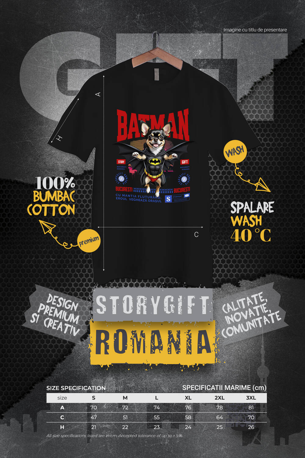 Tricou Barbati cu Chihuahua / Chihuahua Caine In Costum de BatMan cu Pelerina, Erou Nocturn, Desene animate, Copii, Iubitorii de Animale cu imprimeu pe Fata, 100% Bumbac, Negru, L