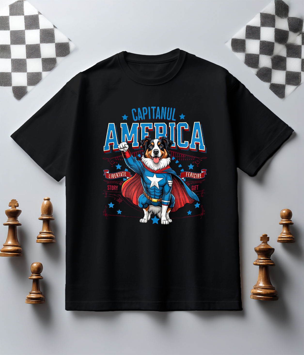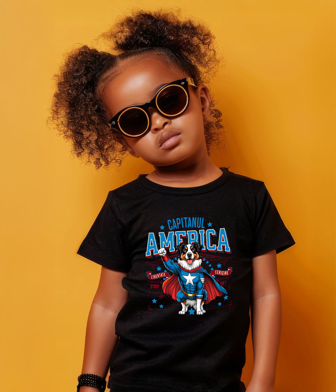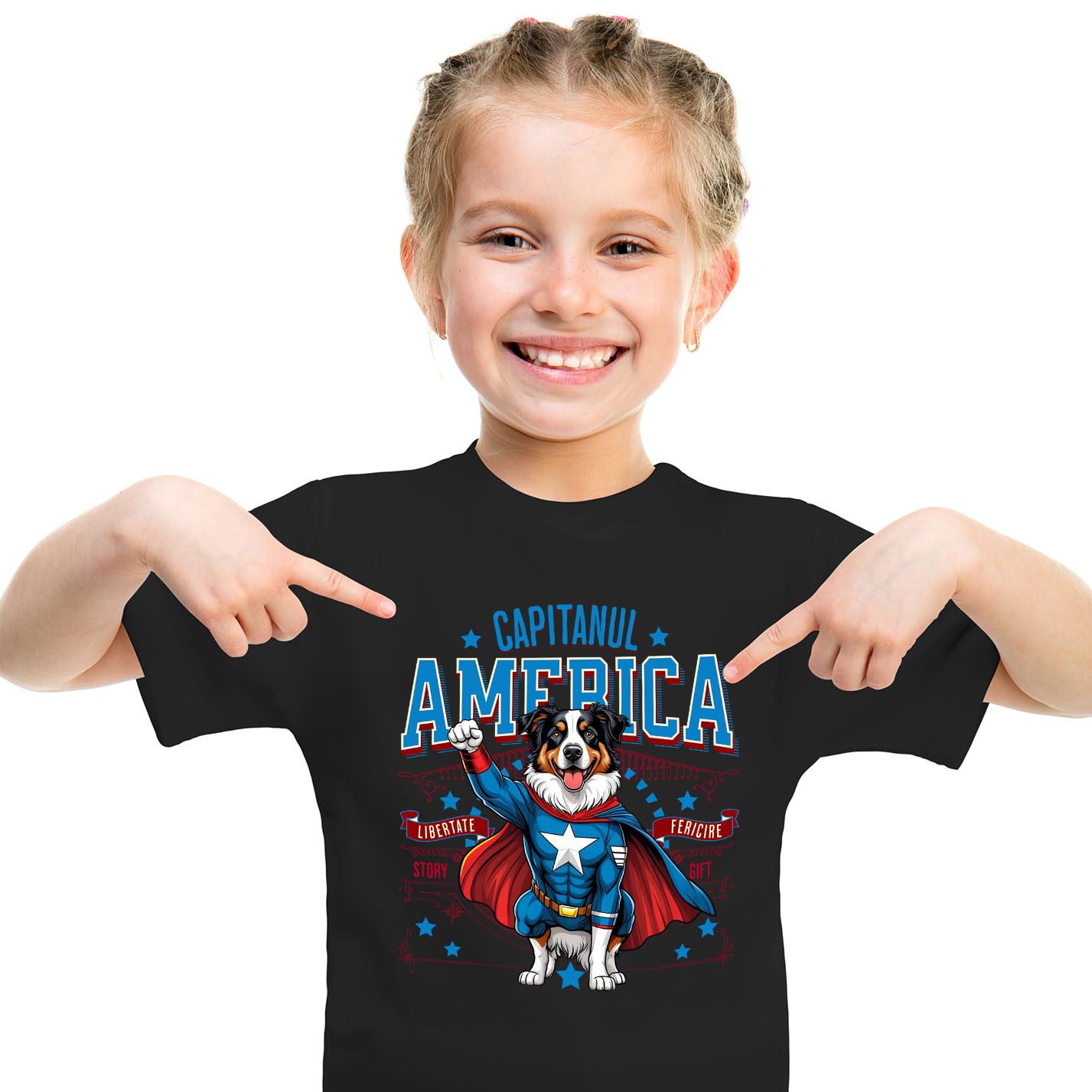Tricou Copii cu Ciobănesc Australian / Australian Shepherd Caine In Costum de Capitan America cu Pelerina, Erou Nocturn, Desene animate, Copii, Iubitorii de Animale cu imprimeu pe Fata, 100% Bumbac, N