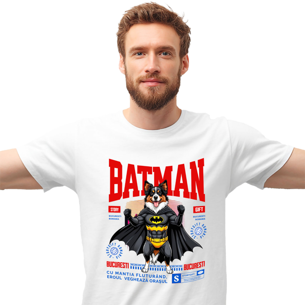 Tricou Barbati cu Ciobănesc Australian / Australian ShepherdCaine In Costum de BatMan cu Pelerina, Erou Nocturn, Desene animate, Copii, Iubitorii de Animale cu imprimeu pe Fata, 100% Bumbac, Alb, XL