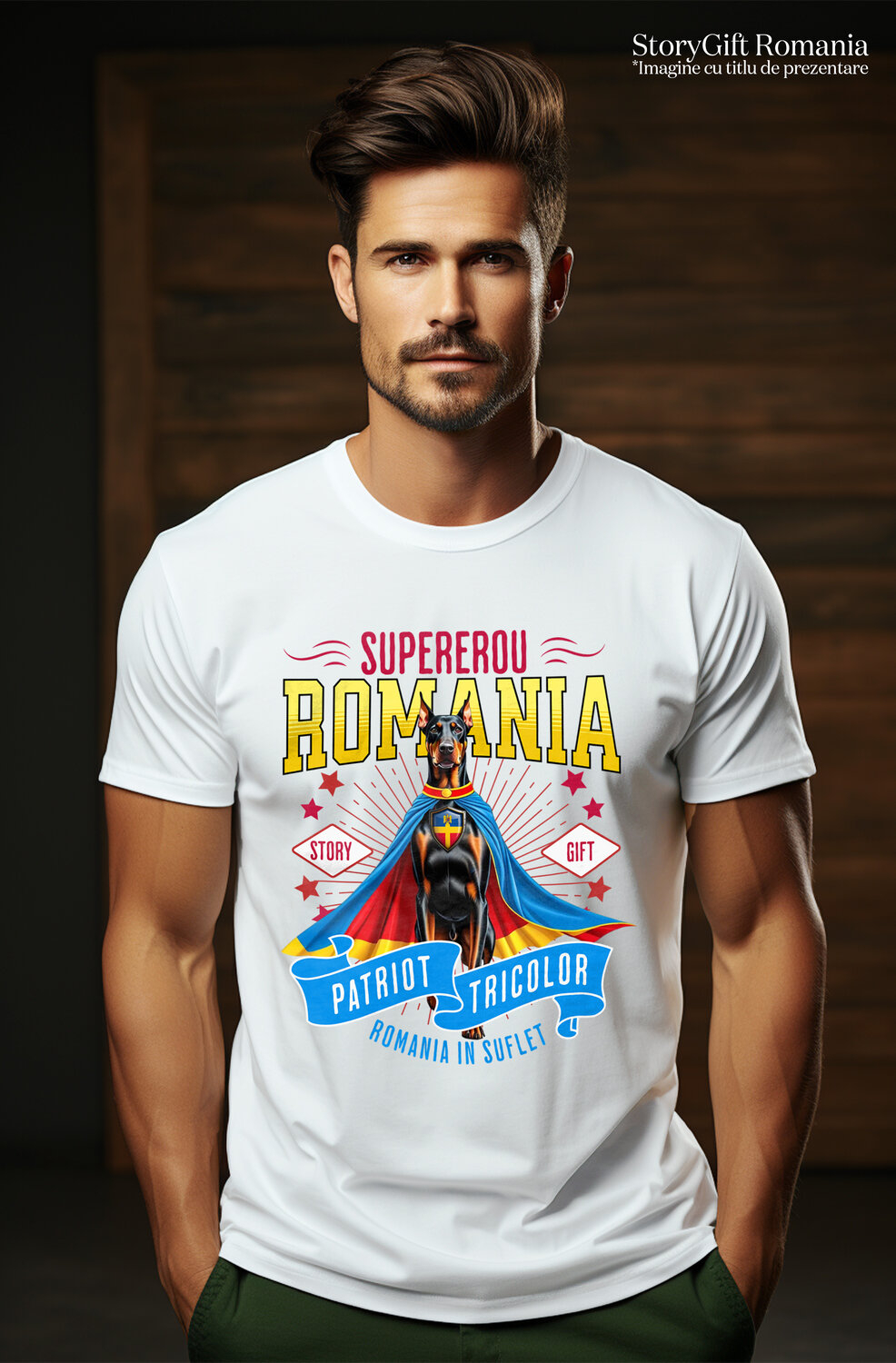 Tricou Barbati cu Doberman Pinscher Caine In Costum de Capitan Romania cu Pelerina, Erou Nocturn, Desene animate, Copii, Iubitorii de Animale cu imprimeu pe Fata, 100% Bumbac, Alb, XL