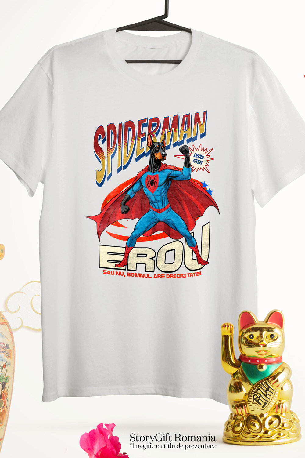 Tricou Barbati cu Doberman Pinscher Caine In Costum de SpiderMan cu Pelerina, Erou Nocturn, Desene animate, Copii, Iubitorii de Animale cu imprimeu pe Fata, 100% Bumbac, Alb, S