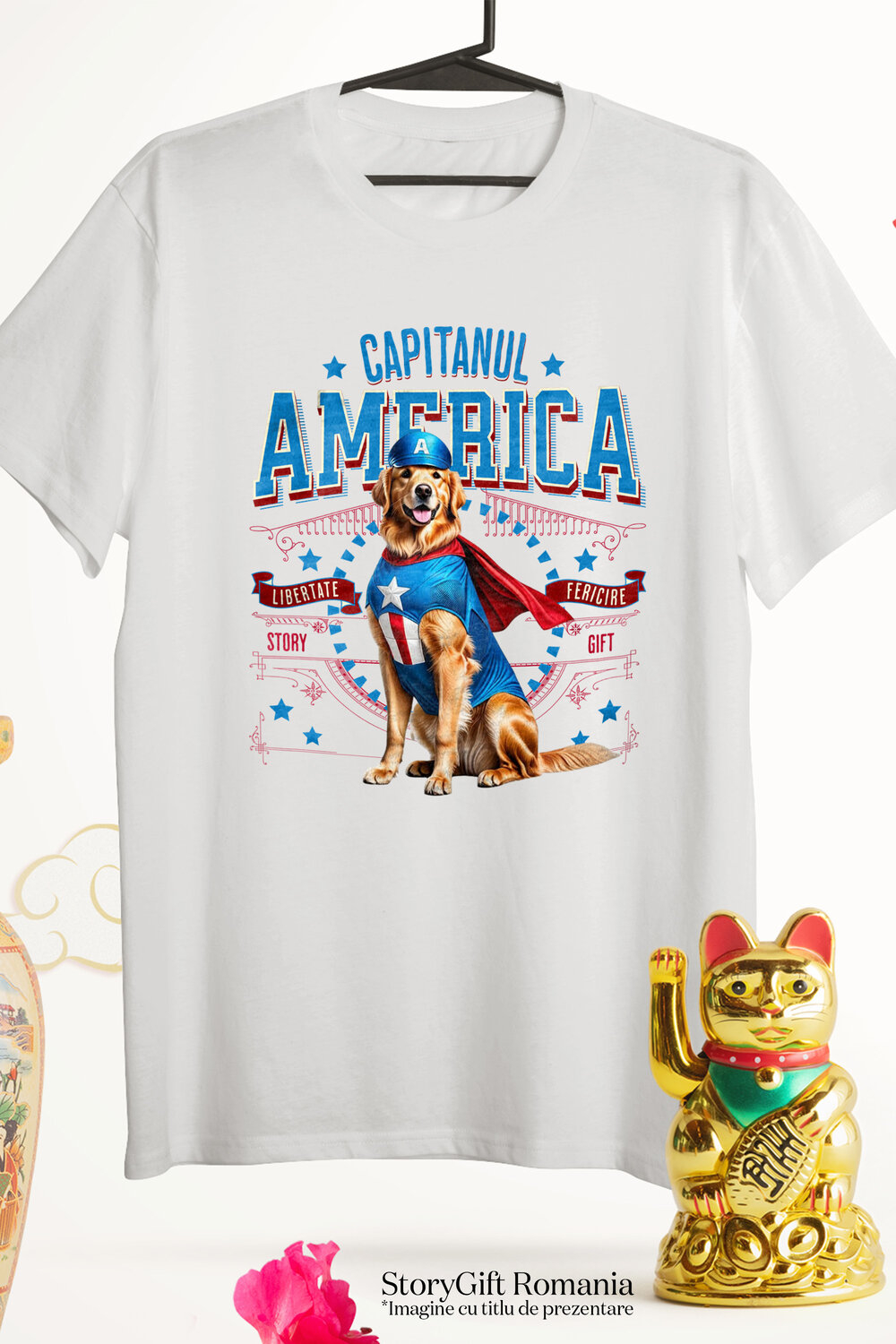 Tricou Copii cu Golden Retriever Caine In Costum de Capitan America cu Pelerina, Erou Nocturn, Desene animate, Copii, Iubitorii de Animale cu imprimeu pe Fata, 100% Bumbac, Alb, 12 Ani